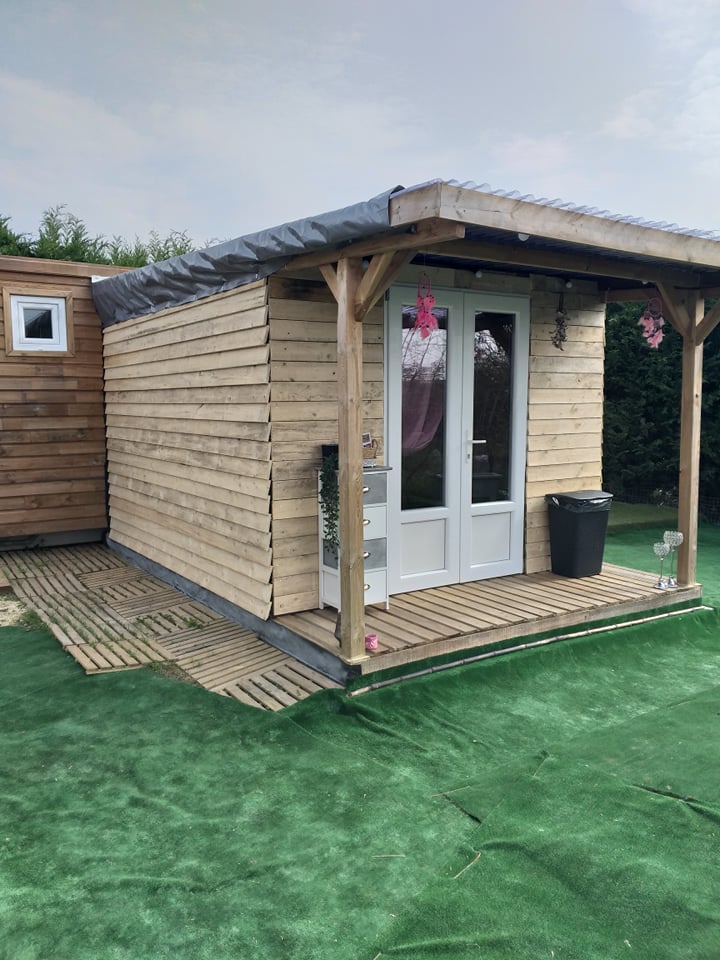 " La Cabane" Voilà le petit coin idéal pour un séjour en amoureux en immersion avec les lieux. Elle est composée d'une chambre tout confort, d'une salle de douche avec vasque, wc et de sa terrasse privée où nous vous servirons le petit déjeuner à la demande au prix de 10 euros par personne Animaux présents sur place chiens, chats, chevaux, poules