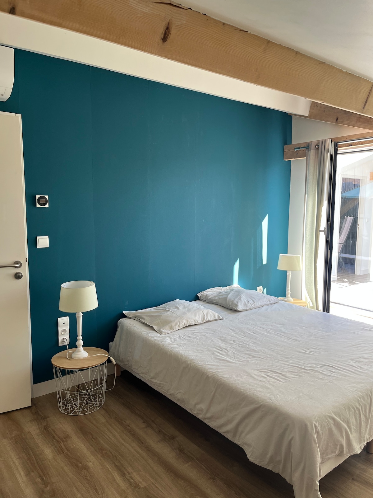 Gîte aménagé à l étage du chai de stockage Cette partie de la ferme était dans le passé le « fenil » : endroit où l on stockait le foin et l étable etait en dessous. En 1998 l’étable devient un chai et le fenil un logement familial, Puis quelques années plus tard un gîte. Avec une capacité de 6 personnes vous découvrirez un endroit moderne et fonctionnel: Une cuisine équipée; Une grande salle bain avec baignoire se situe près de la grande chambre. Superficie 80 m2. CLIMATISATION
