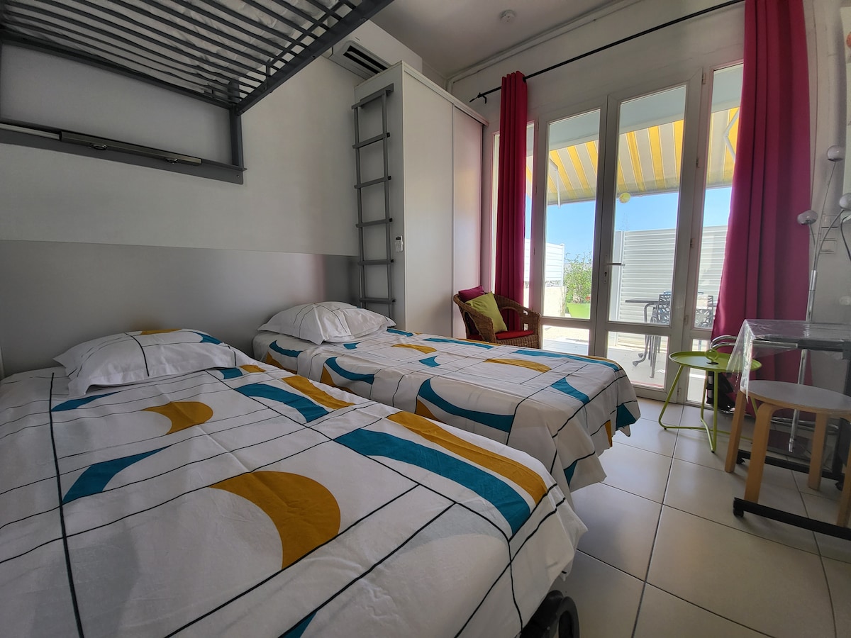 Passez un agréable séjour dans cet hébergement situé au sein d'une résidence de services et qui vous offre tout le confort nécessaire : • Une pièce de vie avec TV, canapé et table à manger/bureau, chaises • Un canapé-lit type BZ en 140 x 190 cm dans la pièce principale, • Un lit mezzanine en 140 x 190 cm, • Un coin cuisine avec micro-ondes, mini réfrigérateur, vaisselle, couverts et ustensils Logement bien éclairé avec parking libre (vous pouvez stationner juste en face).