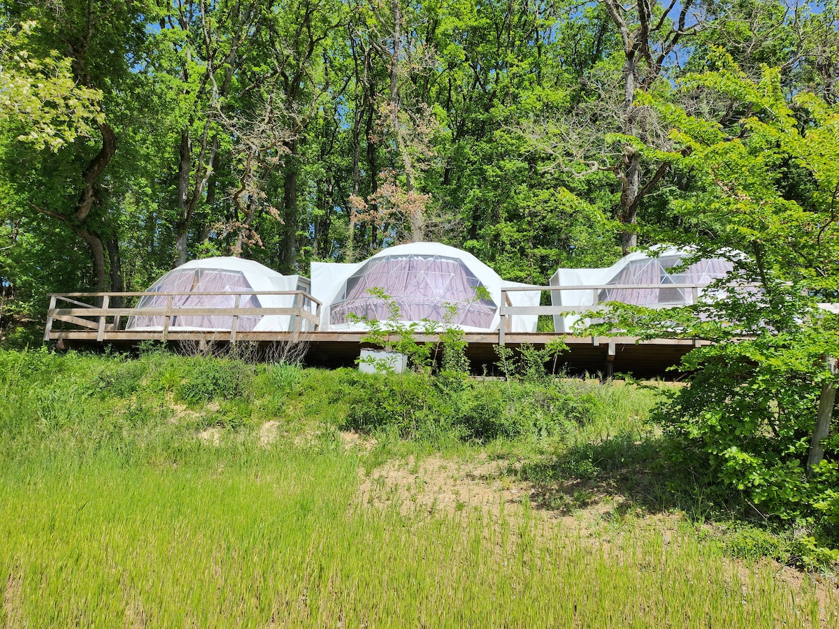 Une lit confortable dans une tente ouverte à 360 degrés sur des prairies, des arbres, des bois, Du calme, de l’espace, des nuits étoilées Des toilettes, une douche rustique et solaire en plein air, un coin cuisine extérieure. Ici pas d’électricité, pas de wifi, mais une connexion gratuite et illimitée à la nature. Idéal pour ceux souhaitant se reconnecter avec la nature.