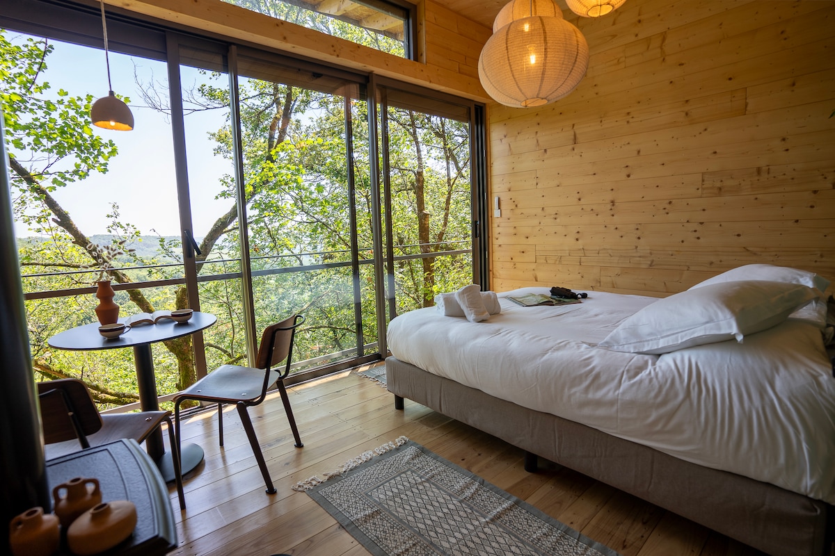 Perchée dans la canopée d'une forêt avec vue sur une vallée sauvage, cette cabane confortable équipée d'un coin cuisine et d'une salle de bain avec toilettes sèches est parfaitement adapté aux passionnés de la nature ou quiconque à la recherche de tranquillité. STRICTEMENT INTERDIT DE FUMER A L'EXTERIEUR ET A L'INTERIEUR ET PAS DE BOUGIES. Absolument aucune. À la place, nous vous fournissons des bougies sans flamme à piles.