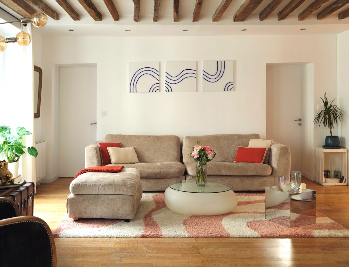 Charme et confort au deuxième étage d'un immeuble du 16ème siècle (troisième étage pour les Américains), dans une impasse calme et pourtant en plein centre de Paris. Poutres apparentes, tomettes, décoration contemporaine, oeuvres d'art du monde entier, grand séjour de 50m2, 2 chambres et 2 salles d'eau, quartier vivant et commerçant, tous transports à proximité. Fauteuil convertible en lit une place dans le salon (déplié, le lit fait 80cm x 190cm). Attention : il n'y a pas d'ascenseur.