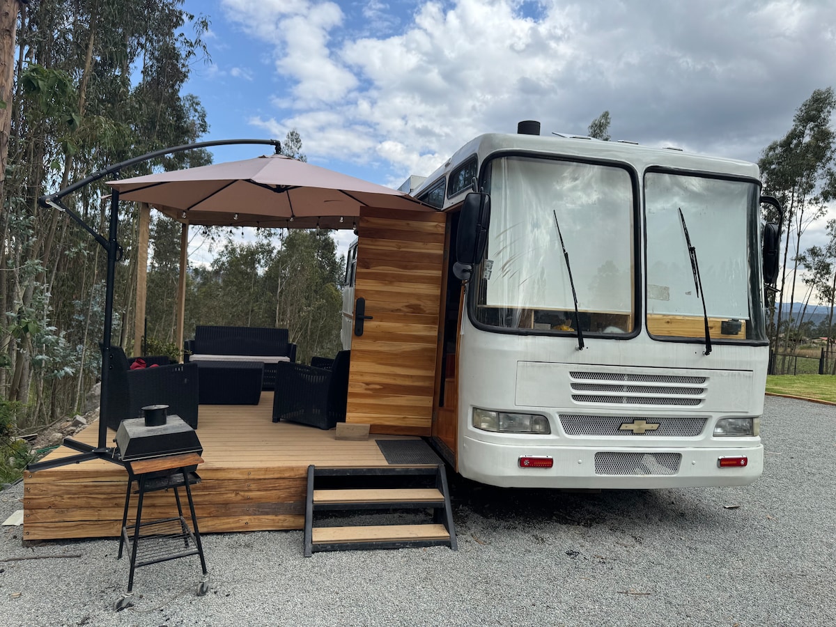 Vive una experiencia única en el Fafa Bus, una casa rodante fija inmersa en la naturaleza a solo 30 minutos de Cuenca. Disfruta de una habitación con cama queen y vista al bosque, sala acogedora con chimenea, sofá cama y cocina totalmente equipada. Relájate en la terraza con jacuzzi, comparte momentos en la fogata y explora amplias áreas verdes. Incluye baño completo, sábanas y toallas blancas, parqueadero y un entorno ideal para desconectarte.