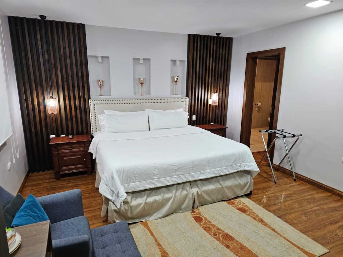 Enjoy maximum comfort in our elegant Deluxe Double Room, designed to offer a superior rest experience. This spacious accommodation combines modern style with cozy details, creating the perfect atmosphere for both leisure and business trips. It features a private bathroom with hot water, a flat-screen TV, and high-speed Wi-Fi. The large windows allow plenty of natural light and offer a pleasant view, ensuring a truly relaxing stay.