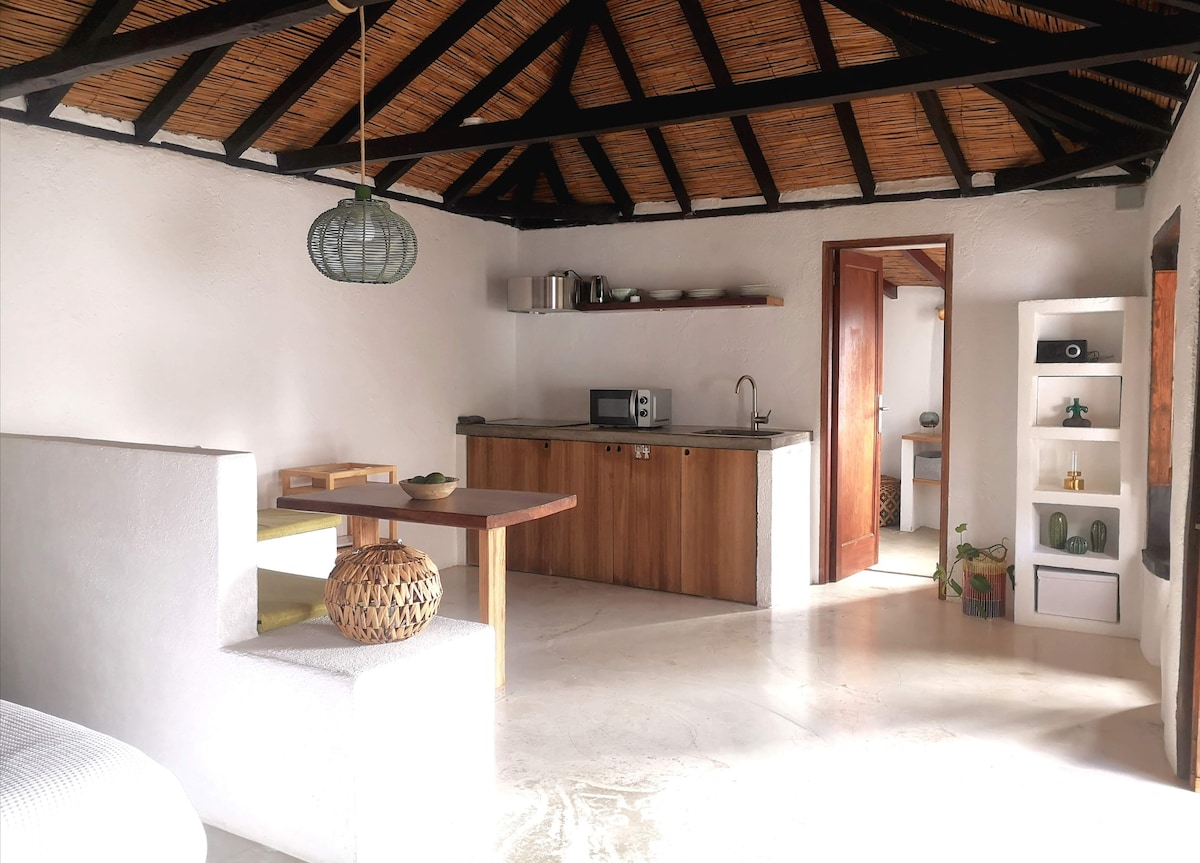 The Finca on 600 m is situated alone in the mountains, 8 km from the beach and 2 km from the village. The access is a dirt road of 350 m which might be a bit difficult for some drivers, but you can leave the car at the entrance and we transport the luggage. Enjoy nature and silence! We grow fruit trees and herbs for our own consumption, all organic and produce our energy with sun and wind.