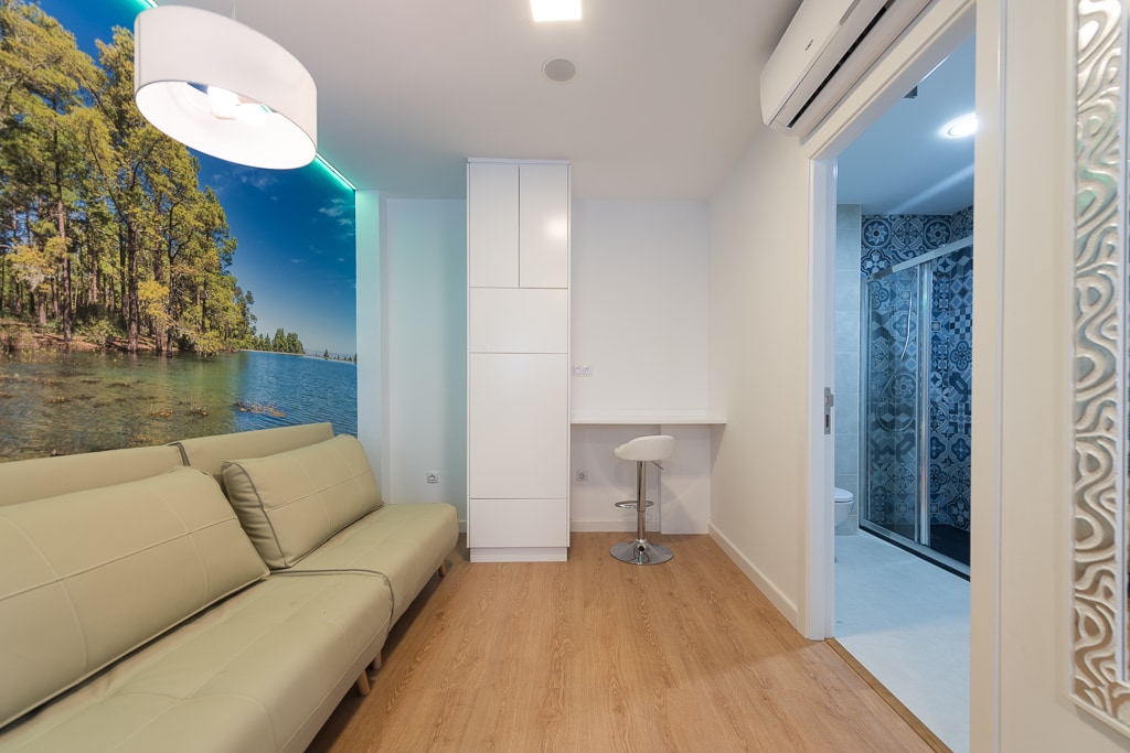 Habitación en suite situada en primera línea del paseo marítimo de Playa Blanca, (Isla de Lanzarote, Islas Canarias). Diseño moderno, con mucha iluminación y amplitud; Se distribuye en un espacio totalmente diáfano que incluye: Vestidor, baño completo, pequeño office con: nevera, congelador y horno/microondas, escritorio, terraza con vistas al mar y a nuestra isla vecina (Fuerteventura) . Cuenta con aire acondicionado/ calefacción, WiFi gratuito, caja fuerte, y smart TV.