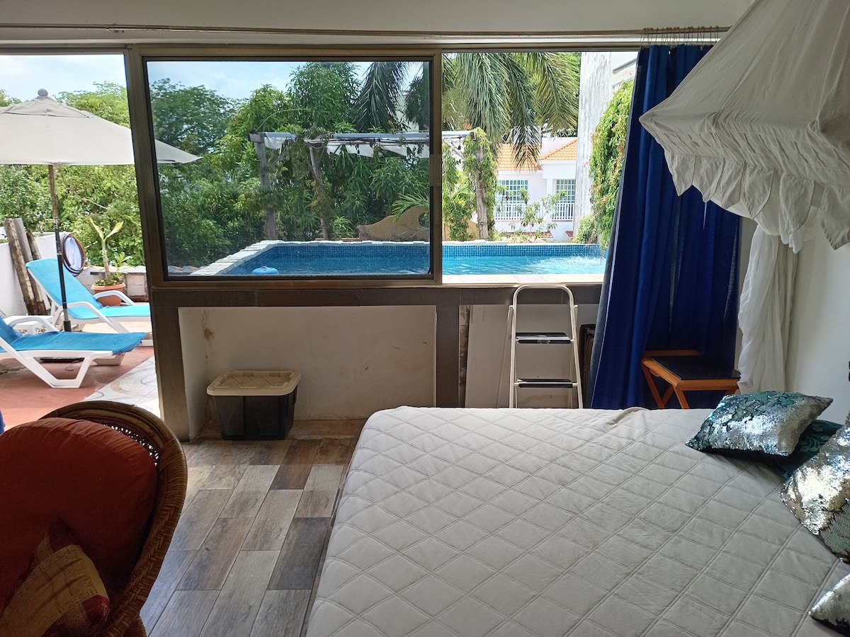 Master suite oceanfront with large window. A peaceful space, perfect for relaxation or remote work with ultra-fast internet (150+ Mbps). Handcrafted interior design by Mexican artisans creates an authentic and cozy atmosphere. Enjoy memory foam mattresses and 100% cotton sheets for maximum comfort. Just 25 minutes from the airport and 10–15 minutes from downtown Cancún. Surrounded by tropical vegetation, ocean sunrises, palm trees, starry skies, shooting stars, pelicans, and flamingos.