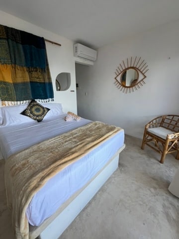 ON THE BEACH/OCEANFRONT! Private entrance. Enjoy a unique room, on-suite private bathroom, walk-in shower, AC, mini fridge and coffee bar.The beach and Mexican Caribbean waters just 5 steps down from the private patio and queen bed. Custom designed and tastefully decorated. Exceptionally clean. Located a short 15-minute walk from Centro and Playa Norte or 3 minute drive by golf cart. Rooftop pool with 360-degree views. Housekeeping service and fresh linens provided after every 3rd night.