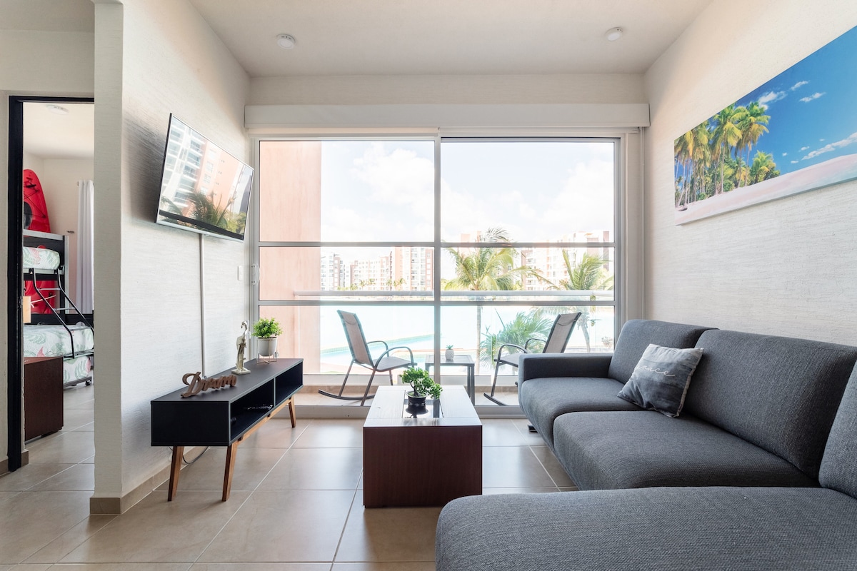 Beautiful Luxury apartment in Puerto Cancun, Hotel Zone, the most exclusive area of the city. Located with a beautiful view of the turquoise blue waters of the Caribbean Sea. Decorated in every detail, your stay will be very pleasant. It has all the necessary services, private parking, access with code and an enviable location! the condominium is connected to the Marina Puerto Cancun Shopping Center and you can walk down to find restaurants, shops, entertainment, etc.