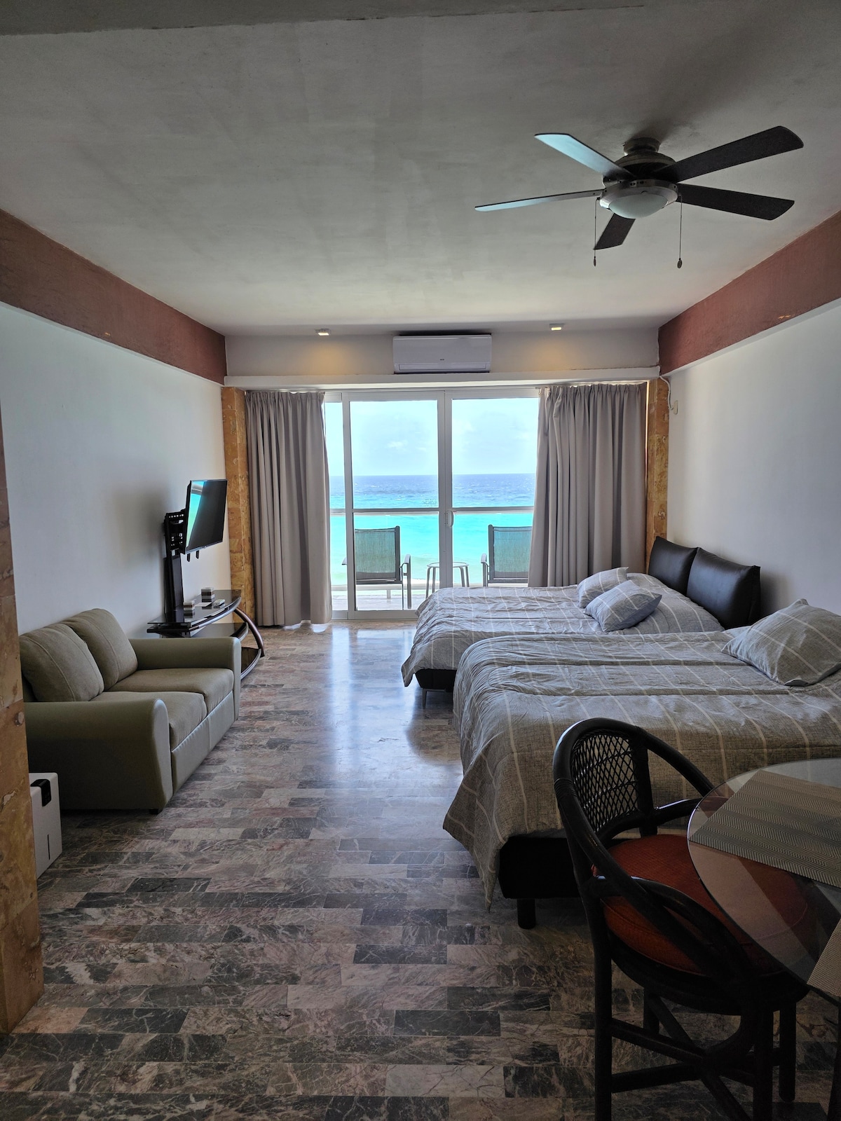 Stylish studio with amazing views, located in a 3 tower condo-hotel, pristine private beach, turquoise water, white sands. Huge wrap around balcony ocean and lagoon view. High speed Wifi, A/c, Smart Tv , safe. Lounge chairs and tents for free at pool and beach. Gym, tennis court, Coffee shop at lobby. Spa (with extra fee) Flexible All Inclusive Option for food and drinks -Pay only for the day(s) you want it-. Decide as your vacation unfolds.(today $95 usd p/p per day) ideal for couples