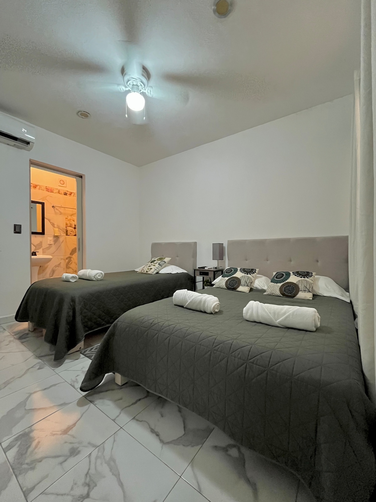 Pearl’s Casita is a charming and cozy retreat, designed for ultimate comfort and relaxation. It features two queen-size beds, a private full bathroom, and a fully equipped kitchenette. The casita also offers a small front patio for outdoor relaxation. Enjoy modern amenities like a Smart TV, high-speed Wi-Fi, air conditioning, and ample storage. You’ll have access to the shared rooftop pool, terrace, and other hotel amenities. Perfect for couples or small groups seeking a peaceful Isla Mujeres.