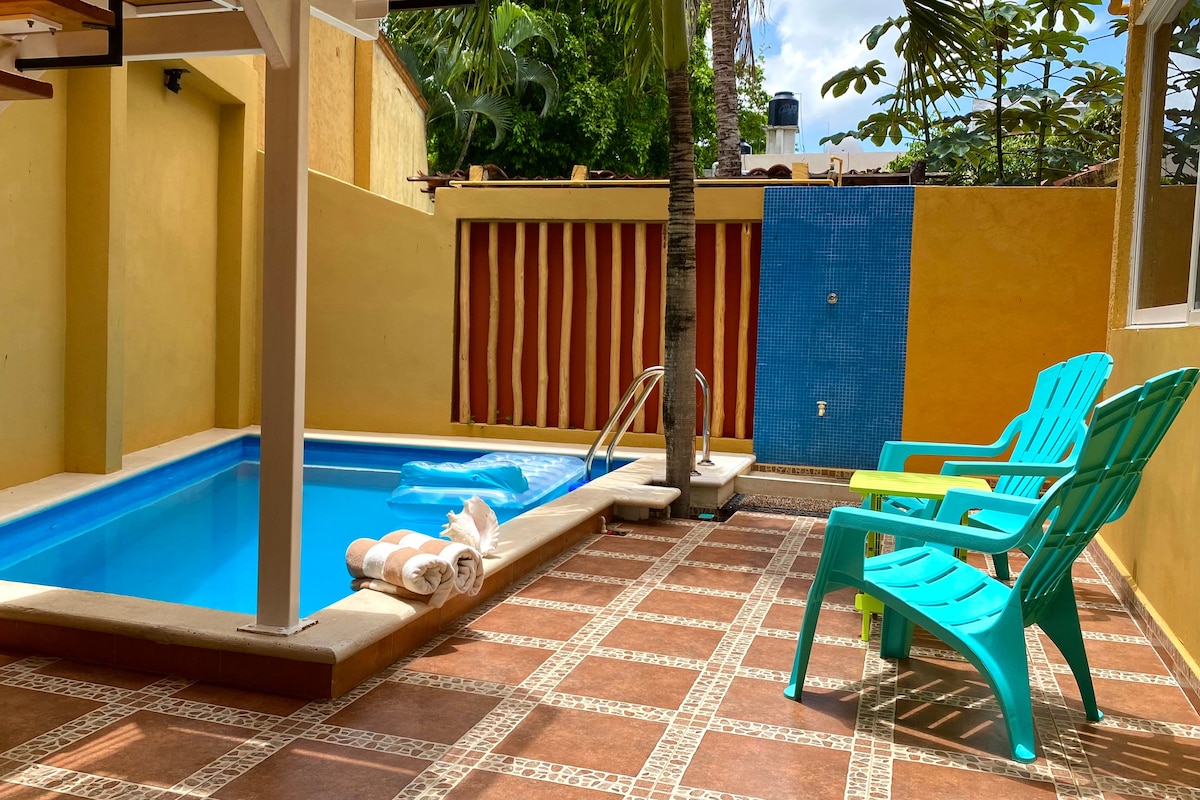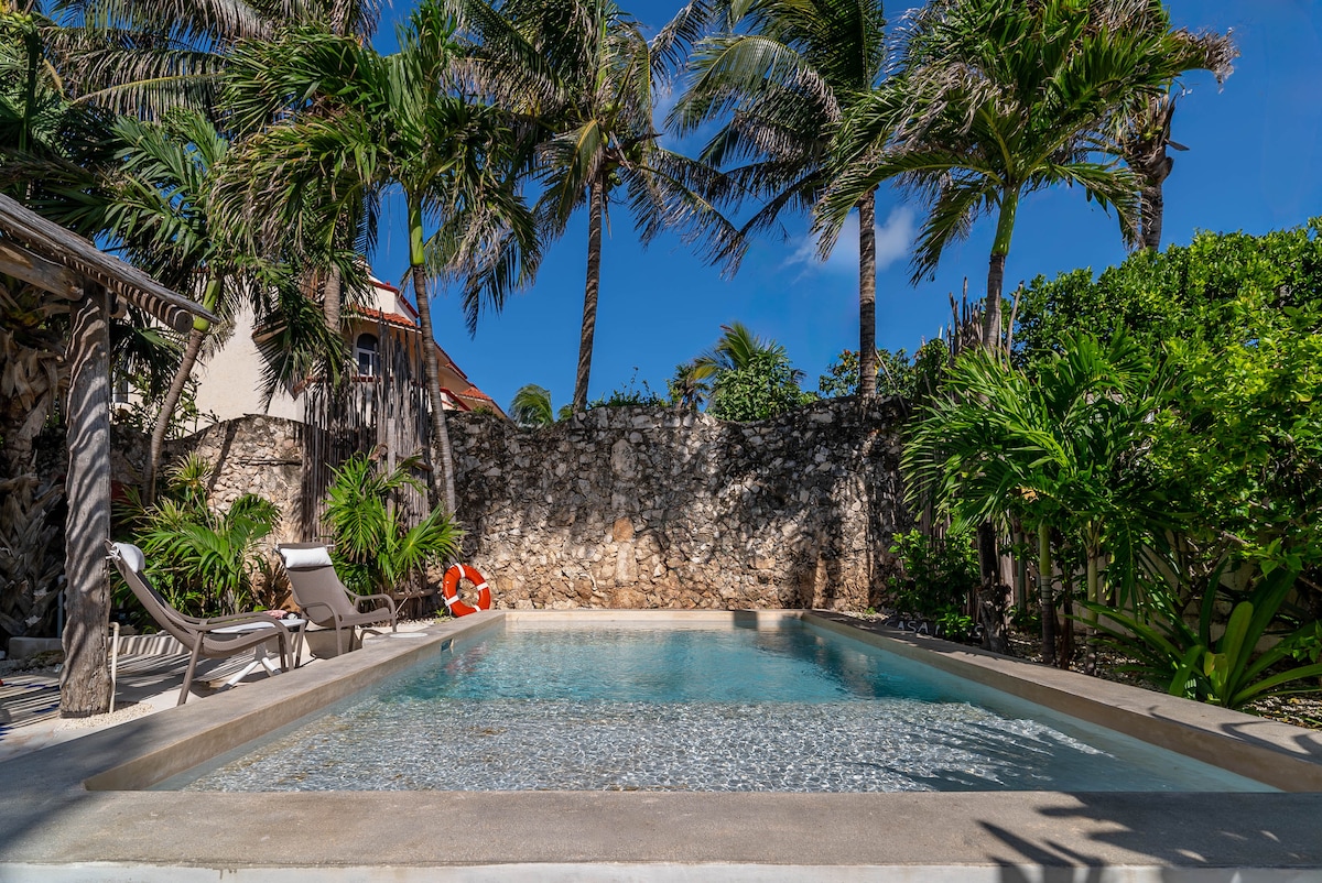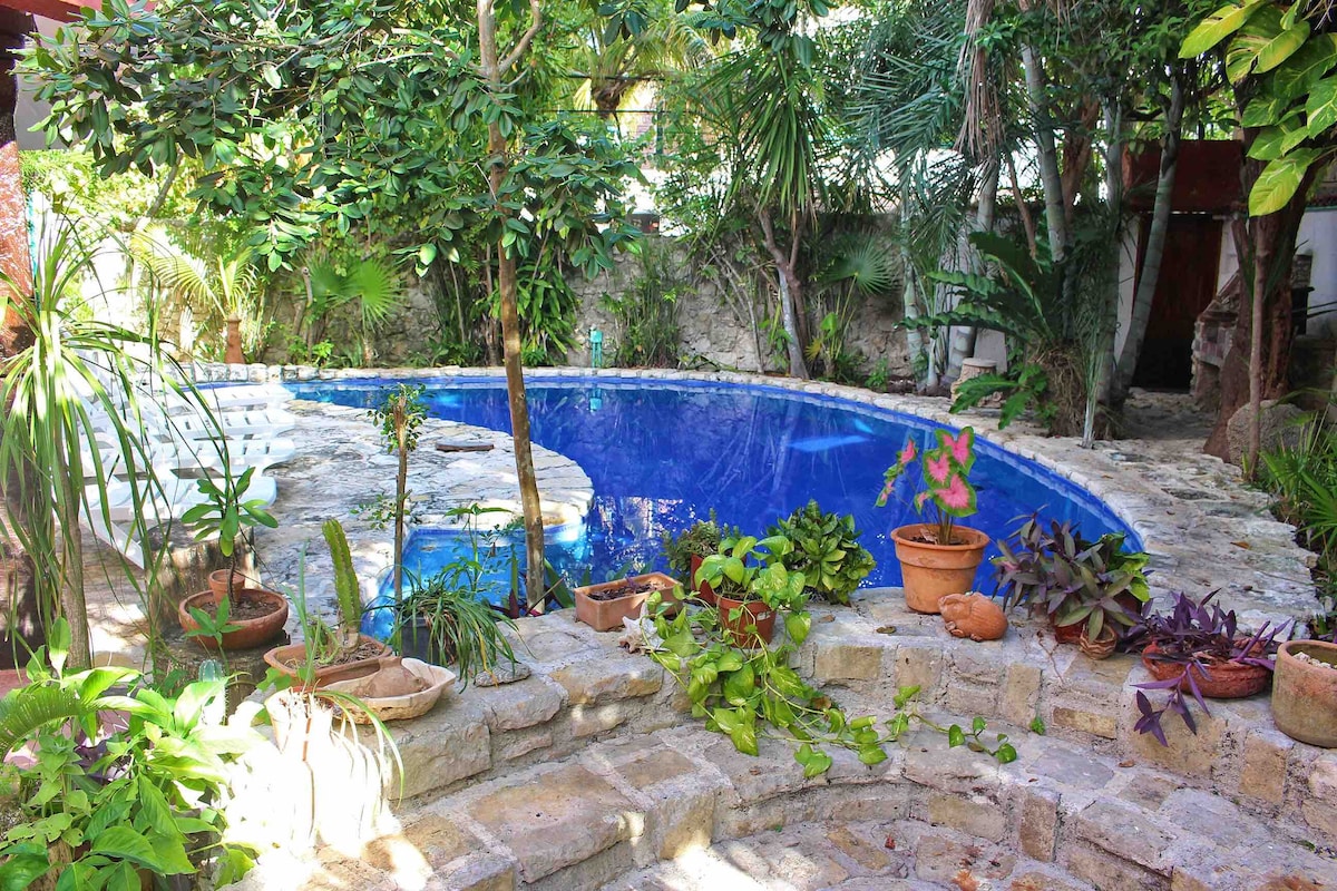 Beautiful luxury house with Mayan and hardwood style. A authentic Prehispanic experience. The suite has a equipped kitchen , bathroom, bedroom with smart TV ,and closet, private terrace and garden and a large shared pool chlorine free. Hermosa suite de lujo con acabados en maderas preciosas y estilo Maya. Una autentica experiencia mexicanca estilo prehispanico. Cuenta con cocina equipada,baño completo,recamara con Smart TV y closet,terraza y jardin privados y gran alberca sin cloro , compartida