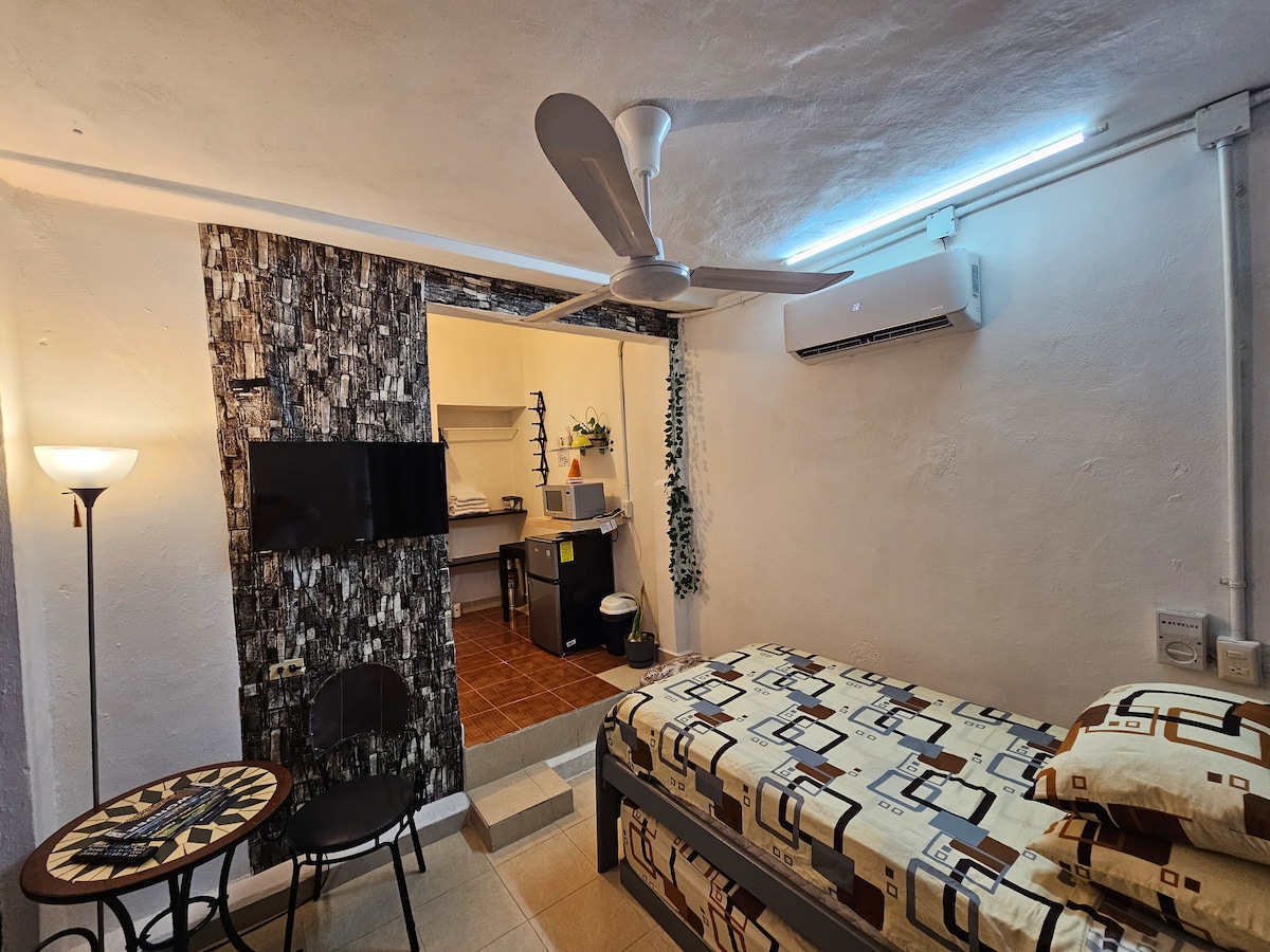 Encantador alojamiento en el centro de Cancún. El acceso hacías el lugar de su estancia es por la puerta trasera de la casa y se llega cruzando un camino de piedra en el área de la alberca compartida. El alojamiento es privado e incluye baño completo y una cocina pequeña, ideal para preparar cosas sencillas o refrigerar alimentos. A pocos metros hay transporte público hacia las playas y, a 5 minutos, la estación de autobuses ADO con rutas al aeropuerto y otros destinos turísticos.