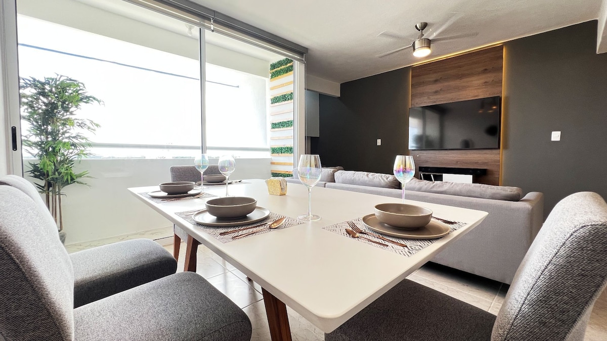 Beautiful Luxury apartment in Puerto Cancun, Hotel Zone, the most exclusive area of the city. Located with a beautiful view of the turquoise blue waters of the Caribbean Sea. Decorated in every detail, your stay will be very pleasant. It has all the necessary services, private parking, access with code and an enviable location! the condominium is connected to the Marina Puerto Cancun Shopping Center and you can walk down to find restaurants, shops, entertainment, etc.