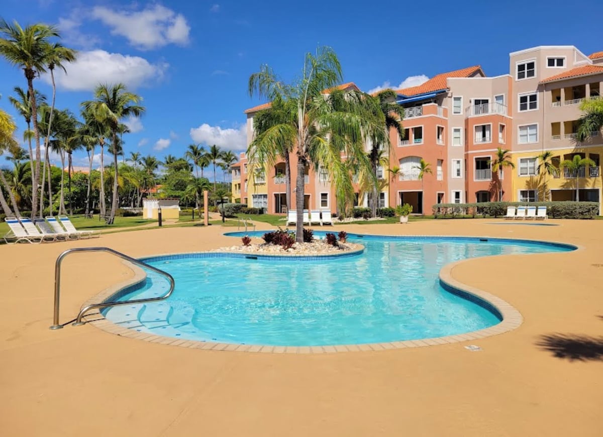 Ground floor 2 Bedroom, 2 bathroom villa. Steps from the pool and jacuzzi. The villa is beautifully decorated with coastal theme. Located 200 yards from the beach, next to the Wyndham Hotel. *2nd Bedroom is very small, intended only for kids. (futon mattress in a bed frame) Palmas Doradas is a beach front complex. The land is about 2,750 acres with 25 neighborhoods, small shops, around 15 restaurants, 2 marinas and a yacht club. Rent a golf cart to move around the resort.