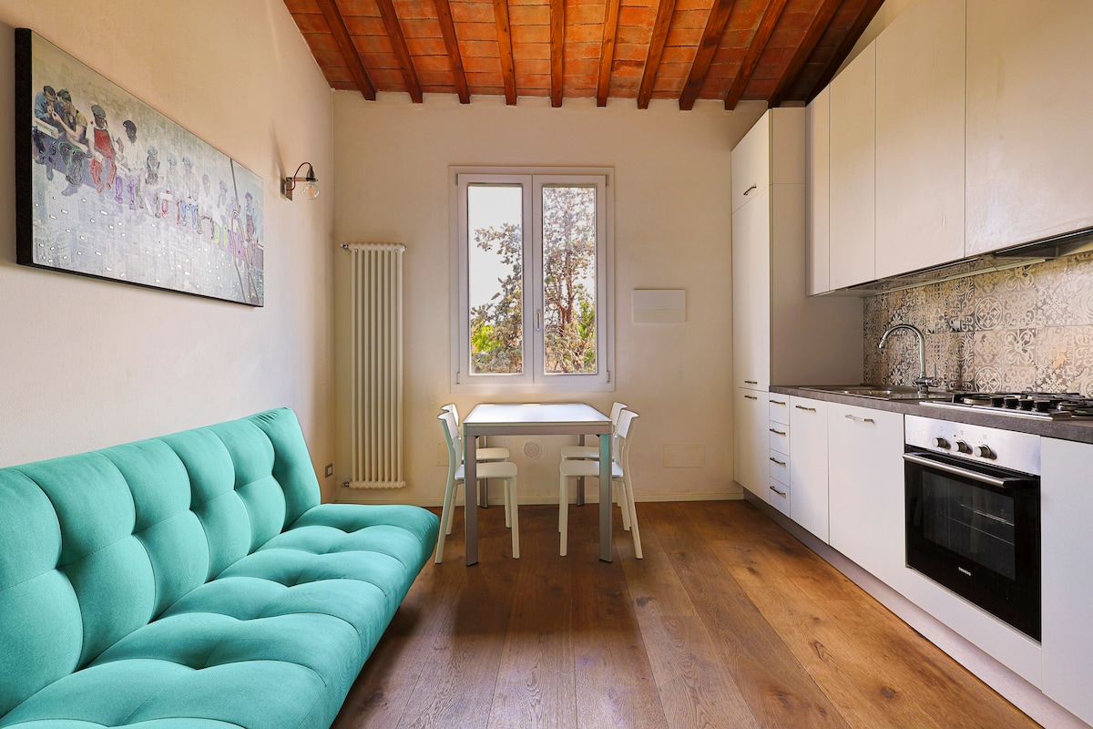 Bilocale in colonica ristrutturata, situato sui colli fiorentini, a soli 7 km dal centro ed a pochi minuti dall'uscita dell'autostrada. Immerso nella campagna, vista spettacolare su Firenze. Composto da cucina salotto con letto matrimoniale camino, angolo notte con letto matrimoniale alla francese cm 140. Esterno con ampia terrazza, giardino condominiale giardino privato, campo coltivato ad ulivi a disposizione seggiolone e lettino da campeggio Posteggio privato all'interno della proprietà