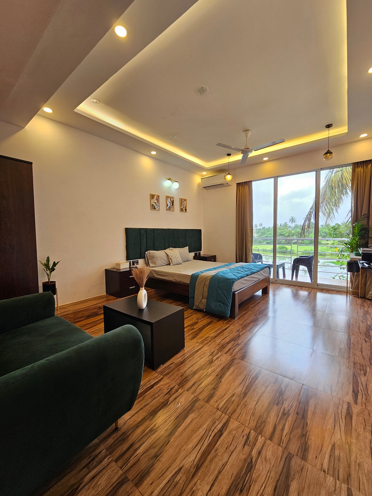 Cute & Cozy Riverside Studio in Siolim, Goa This charming yet spacious studio is centrally located in Siolim, right next to the river, and just a 13-minute drive to the sandy shores of Morjim Beach. Grocery stores and restaurants are only a 5-minute walk away for your daily needs. Popular spots like Thalassa, Kiki by the sea and other well-known party venues are only a 10-minute drive, making it perfect for guests who want to enjoy both calm mornings and lively evenings.