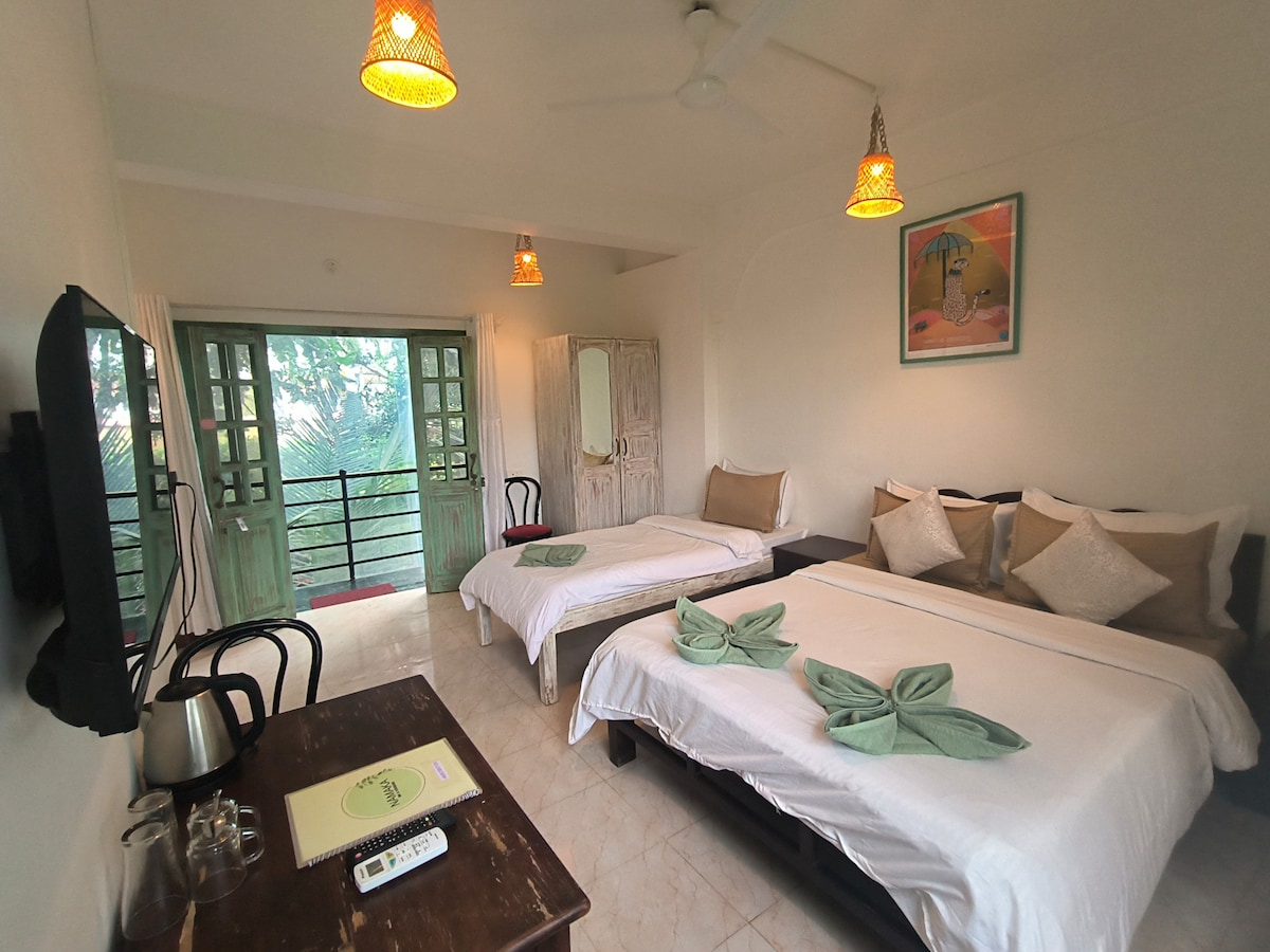 Embraced by the breath taking beauty of tropical landscapes, our air-conditioned rooms radiate elegance, showcasing antique wooden furnishings, plush woven carpets, and remarkable craftsmanship. The room features a magnificent 150-175- year-old antique king bed and wardrobe, providing a cozy retreat for two adults, with the option to add an extra bed for enhanced comfort. Delight in your own private sitting area, beautifully appointed with a luxurious sofa set etc..
