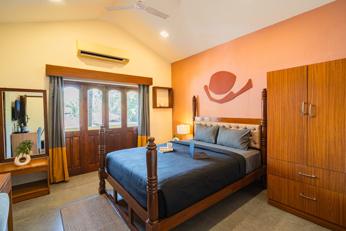 Our Signature Room is a design-forward space featuring a King bed, an open to sky bathroom, and a bathtub blending comfort with thoughtful aesthetics. The room is equipped with high-speed Wi-Fi, air conditioning, and a smart TV for a seamless stay. Located just 1.5 km from the beach and 900 meters from the local market, the property offers easy access while remaining a peaceful retreat. Our spaces are intentionally designed to foster community, creativity, and authentic travel experiences.