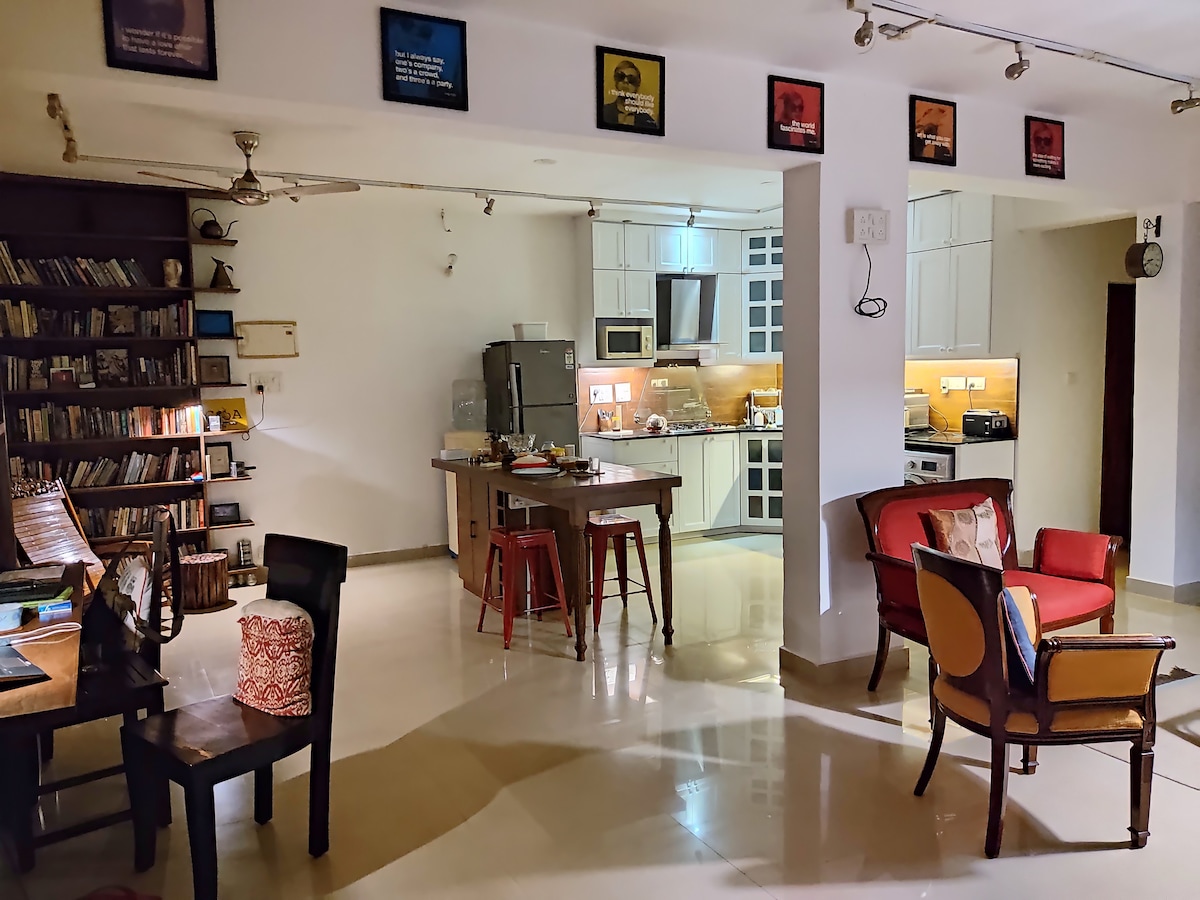 Imagine entering a modern & thoughtfully designed apartment with lush edible balcony gardens that you share with birds & squirrels. Located in Siolim Marna, this 1BHK is designed for couples, solo travelers & offbeat families on a short vacation, a longer workation or a peaceful retreat. We love all things design and DIY. Every piece of furniture has been upcycled and we've tried to think of everything you might need- wifi on backup, a bar, an equipped kitchen, a swing, books & art supplies!