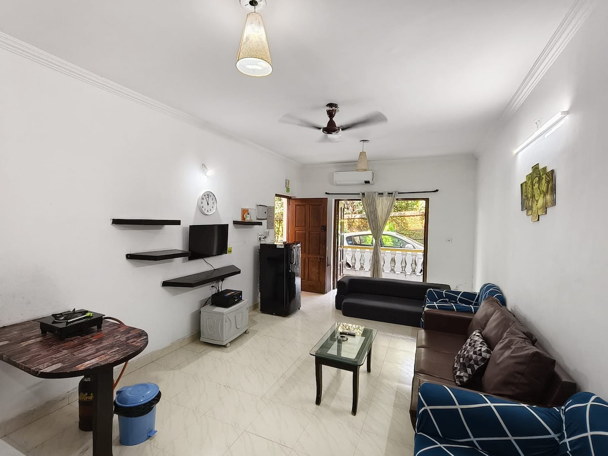 Modern Boho Apartment | Minutes from North Goa's Beaches.A cosy, fully furnished 1BHK retreat perfect for couples, friends, or small families. Highlights: - Stylish boho interiors with a warm vibe - AC in bedroom & living room for comfort - Smart TV + High-speed WiFi - Equipped kitchen with RO water, cooktop, fridge & washing machine - Shared swimming pool (9 AM–6 PM | swimwear mandatory - On-site gym available as a paid facility - 24/7 security for peace of mind - Free Parking