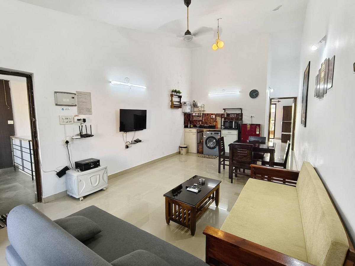 Certified by Goa Tourism 950 sq ft air-conditioned apartment: 2 bedrooms, 2 bathrooms, TV/living room, open kitchen; laundry nook + 500 sq ft non-air-conditioned space: dining for 4; sunroom sit-out; shaded patio; open-air balcony 300mbps internet; 4-5hr power backup; 50" Smart TV; books; board games; workstation & covered car park Located in Porvorim: 15min Panaji/Mapusa; 25min Calangute/Baga; 30 min Anjuna/Vagator; 45-60min Ashvem/Mandrem/Arambol; 60-75 min South Goa beaches; 120min Palolem