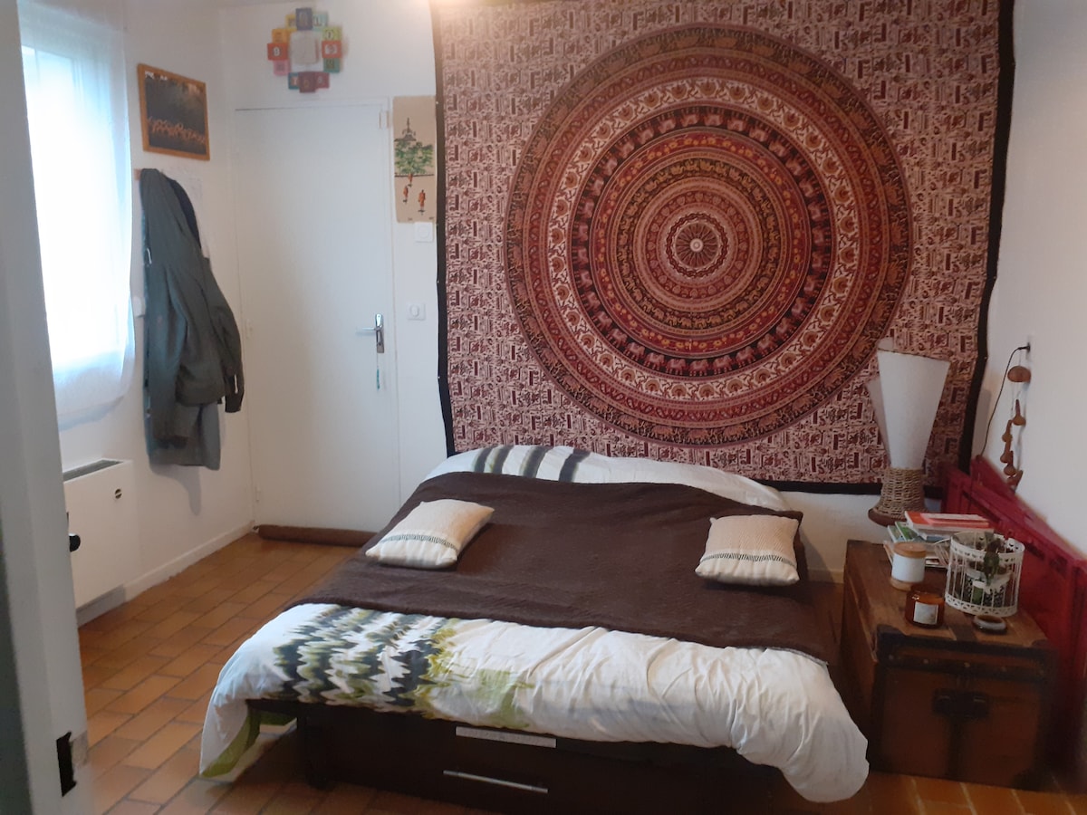 Cozy studio , attached to a family home. It is tastefully furnished. The entrance-vestibule is shared. But once the door of the studio has passed, everyone is at home...it is composed of a living room with sloping ceilings overlooking the garden. It has a bathroom, WC & kitchenette Note, the bed is 120 therefore more suitable for a single person and it does not have TV but WIFI. The neighborhood is very quiet. Surrounded by park and forest. You can park easily on the square.