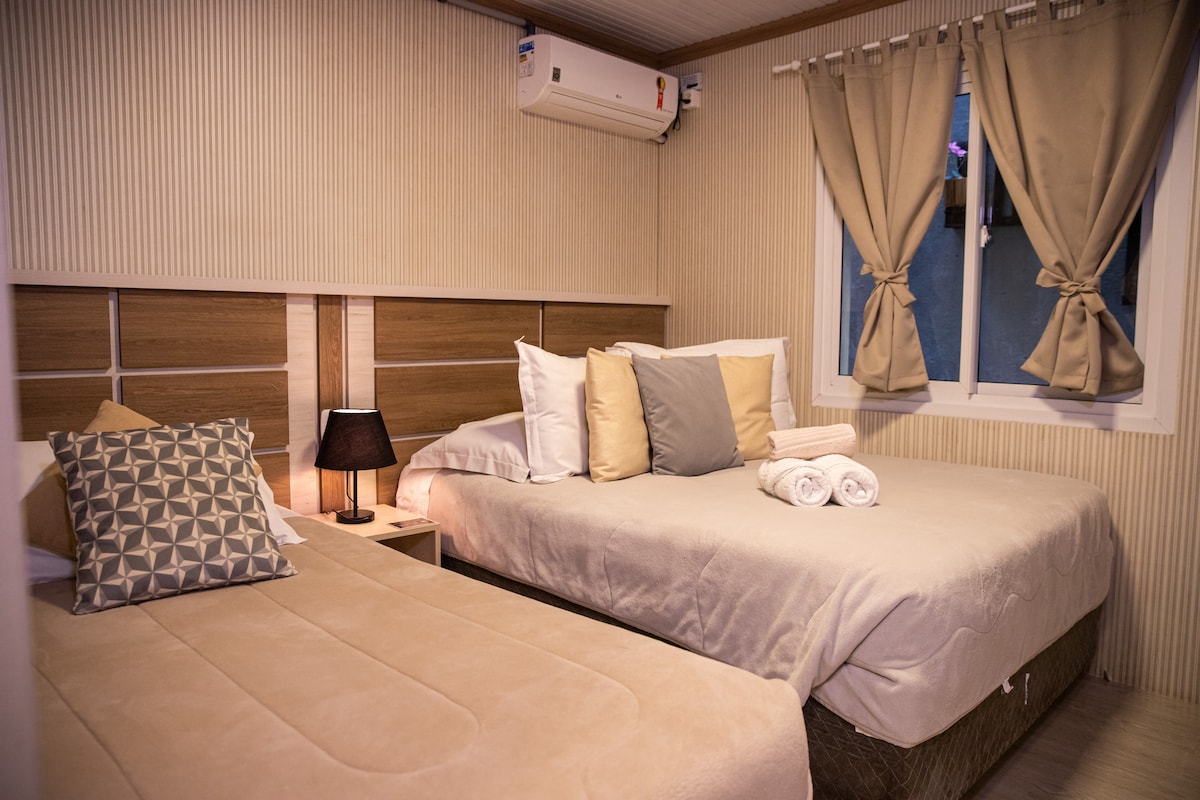 Desfrute de uma estadia aconchegante em um quarto triplo, composto por uma cama de casal e uma cama de solteiro, com banheiro privativo. O quarto está equipado com ar condicionado inverter quente/frio, TV de tela plana e frigobar.