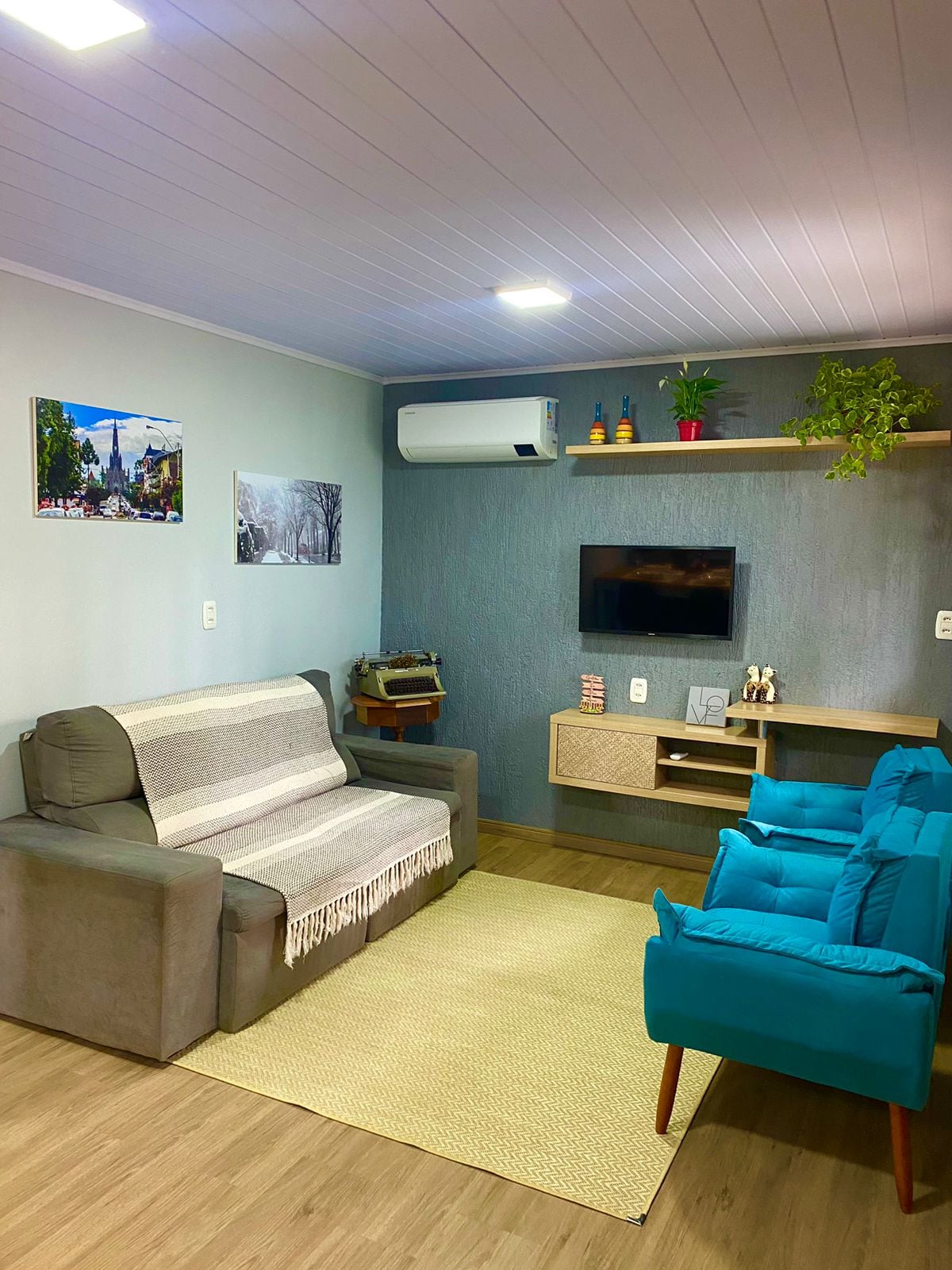 Apartamento novo, totalmente mobiliado, com lareira interna, churrasqueira com espetos e todos os itens de cozinha. Varanda e suite com vista para a catedral de pedra. Melhor localização de Canela. Possui duas garagens amplas, para deixar o carro com segurança enquanto desfruta da cidade caminhando. Possui ainda máquina lava e seca, ferro de passar e secador de cabelos. Chuveiros, duchas e torneiras com água quentinha além de ar-condicionado nos dois quartos.