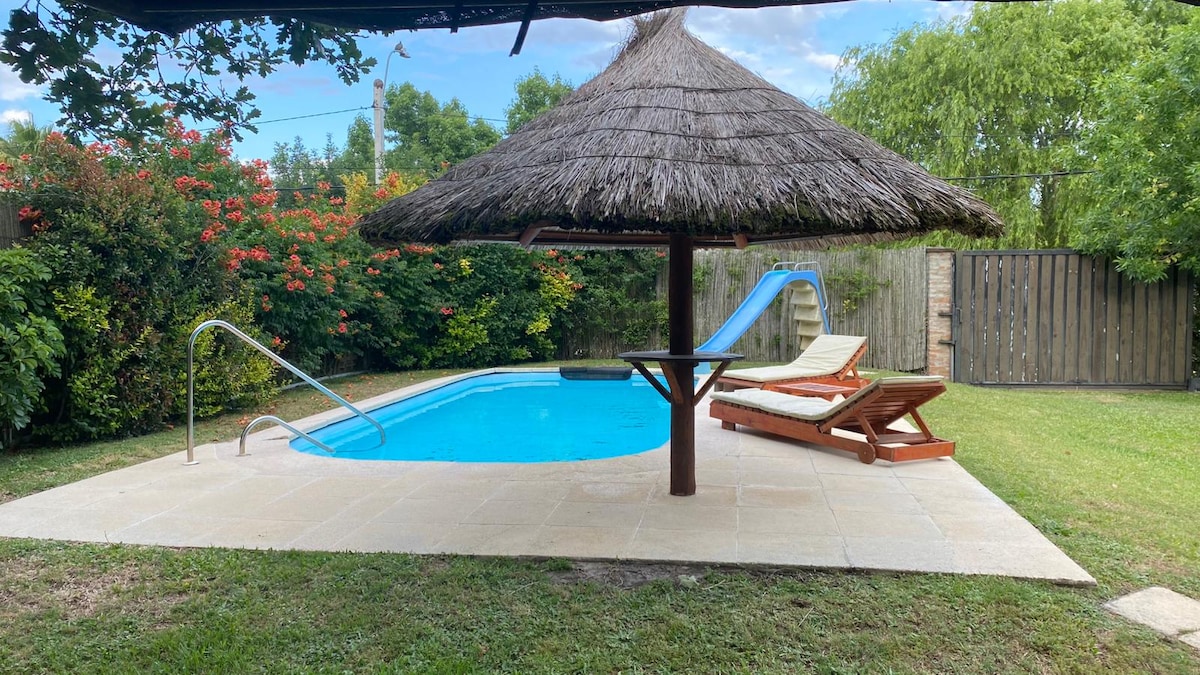 Hermosa casa en El Pinar, llena de vida y color . Con hermoso jardín, piscina y parrillero, con vista al bosque de pinos. Recomendada para parejas . Ambiente tranquilo rodeado de naturaleza, ideal para desconectar. A cinco cuadras del arroyo , siete de la playa, y rodeada de bosque Muy Amplia , cómoda y con mucha energía.