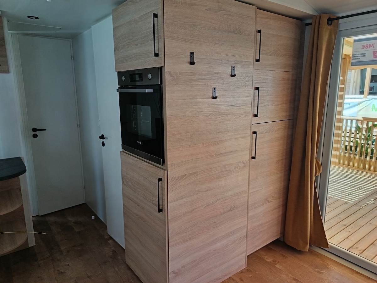 MOBILHOME 6 places 40 m² avec climatisation réversible, grande terrasse extérieure clôturée avec 1 portillon sécurisé , salon de jardin, 2 transats. Vaste salon avec télé orientable, 1 canapé convertible 2 places, 2 grandes chambres dont 1 parentale, literie haut de gamme avec grand dressing et TV Cuisine équipée, vaisselle, four, micro-ondes, plaque de cuisson, frigo avec congélateur , grille pain, bouilloire, cafetière filtres et TASSIMO dosettes, lave-vaisselle, machine à laver et étendage.
