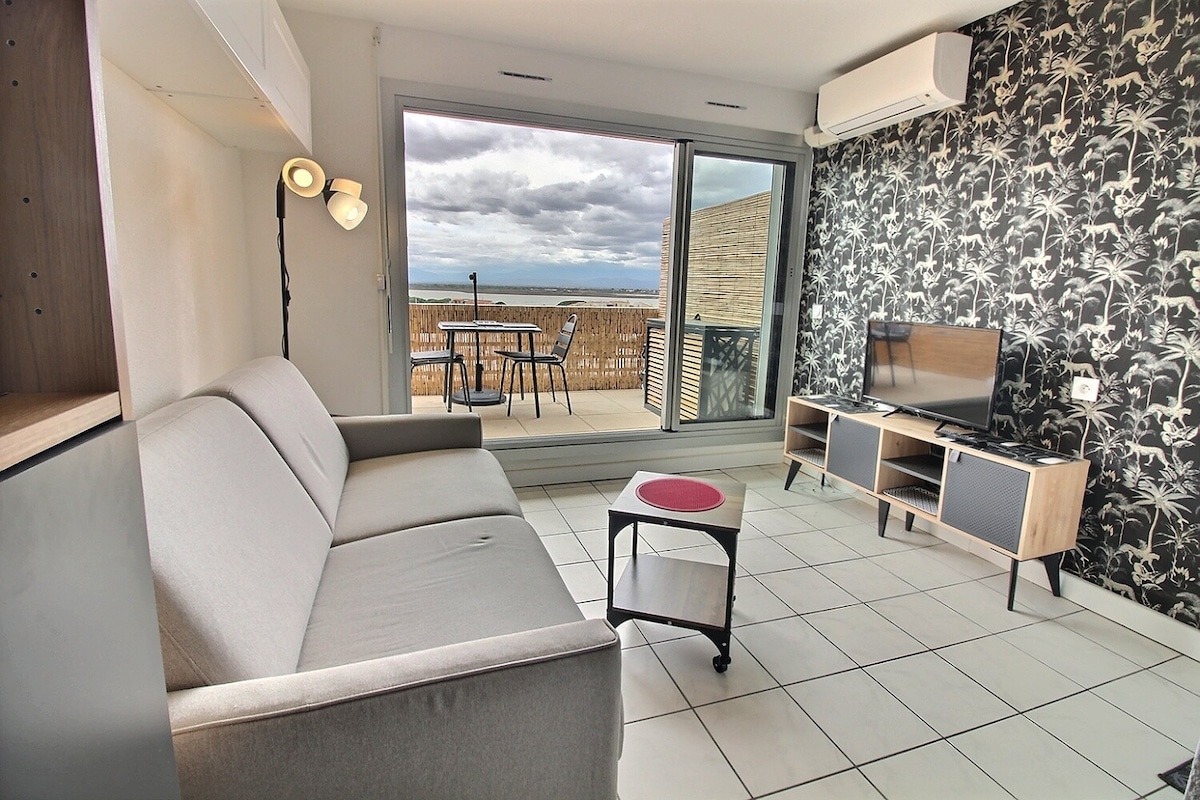 Spacieux appartement T2 en front de mer avec parking privé refait à neuf avec goût. Très bien orienté, vue sur la mer et les montagnes. Aucun vis a vis. Au calme mais proche de toutes les commodités, tout est accessible à pied. Terrasse, cuisine toute équipée, barbecue électrique , salon de jardin, tv, internet wifi. Literie de qualité avec vrai matelas dans le canapé lit. La chambre séparée, calme et spacieuse permet de se sentir à l'aise à 4 personnes. Local vélo.