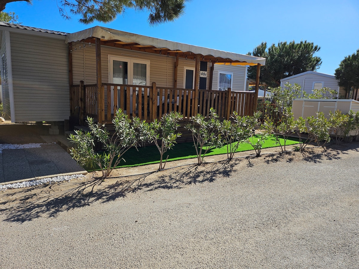 Jolie mobil-home dans un village de vacances 4 étoiles (le mar estang). Le village de vacances est idéalement placé entre mer et montagne, à la frontière de l'Espagne, situé entre la plage, l'étang et la réserve naturelle. Le mobil-home est à 50m de la plage et dispose d'un accès direct. Le mobil-home est neuf, moderne et très bien équipé. Il dispose d'une terrasse sur laquelle vous pourrez passer des soirées chaleureuses et conviviales. fun pass piscine et linge non inclus