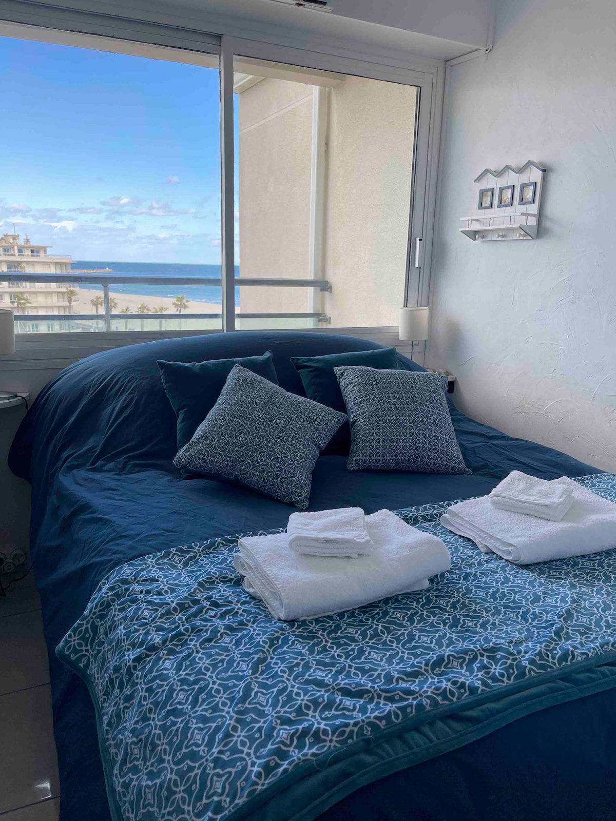Studio vue mer au 5ème étage avec ascenseur. accès handicapé.Commerces et plage à 50m.Cuisine équipée frigo top, plaque induction,micro onde grill, cafetières filtre et senséo. Canapé lit (145 x 195), télé, clim réversible,WIFI. Balcon fermé équipé plancha. 2 lits superposés. Laverie automatique, supérette à proximité. Carte accès Parking sous-terrain à 500 m gratuit du 1/7-31/8. Draps et serviettes sur demande (10€/pers). Piscine de fin avril à début octobre (horaire reduit arreté préfet)