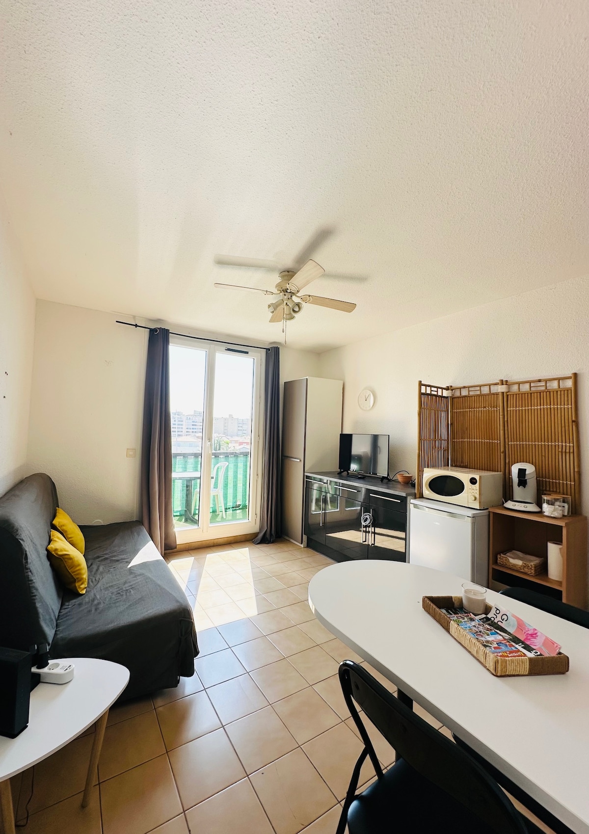 Studio lumineux meublé de 32m2 climatisé en plein cœur du Boulou, à deux pas de toutes commodités. Volets électriques et doubles vitrages. Wifi gratuite, fibre optique. Plusieurs parking public gratuit, à 4 minute à pied de l’appartement. Situé entre mer et montagne de belles ballades vous attendent (site historique de la bataille du boulou…) A 15 minute de l’Espagne, de Perpignan, Argelés-sur mer et de Céret. Proche des cures thermal, du Casino et de la piscine municipal.