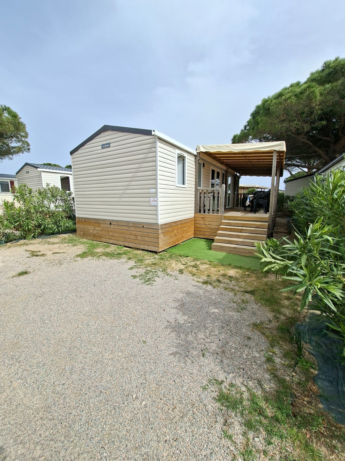 Profitez de vos vacances dans ce mobil-home haut de gamme et très bien équipé. Vous profiterez de 3 chambres dont une suite parentale avec sa douche et son wc . Un deuxième wc et une deuxième salle de bain complète boby ! A cela s'ajoute une grande pièce de vie avec climatisation, cuisine entièrement équipée avec lave vaisselle, et un canapé convertible pouvant accueillir 2 personnes. A l'extérieure une grande terrasse couverte ! En plus la place de parking pouvant accueillir le véhicule !