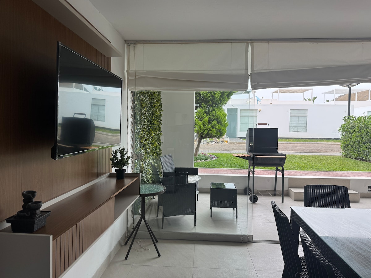 Casa de playa frente a parque en condominio privado Playa Azul, a 15 mts. del malecón, amplia terraza con gran parrilla, piscina para niños con vista al mar. Hay areas comunes para deportes, piscina y juegos para niños, piscina y juegos para adultos, restaurant y market.(temporada verano) Ubicado a 5 min. de Cerro Azul, a 15 min. de Tottus y a 20 min. de Wong Asia. Ideal para pasar la pandemia en familia, cuenta con TV y directv con paquete HBO Premium, WIFI opcional Seguridad las 24 horas