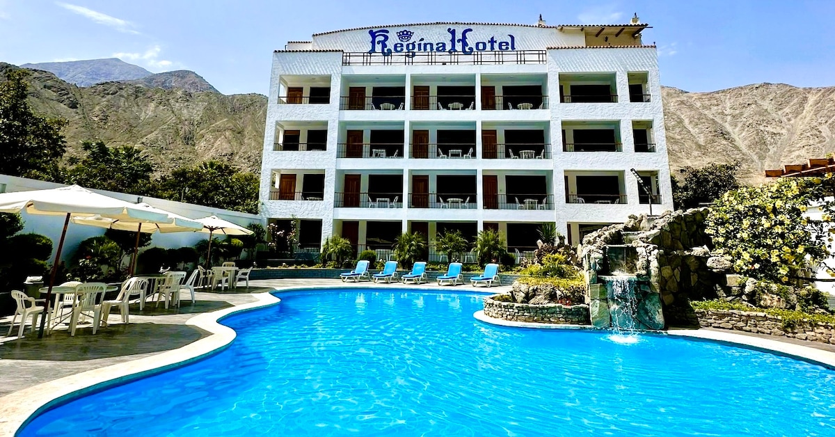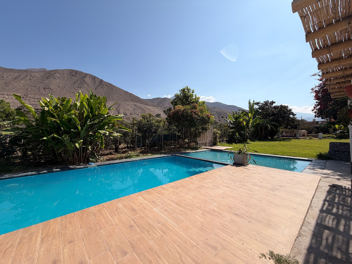 Bonita habitación para pareja, ubicada en el cálido valle de Calango, a 1 hora y media de la ciudad de Lima. - Para 2 personas. - Cama Queen (2 1/2 plazas). - Baño privado. - Mesa + 2 sillas. - Balcón - Wifi - TV smart - frigobar Además en las áreas compartidas: - estacionamiento privado. - zona de parrilla. - Zona de fogata. - Piscina para niños y adultos. - áreas verdes - Restaurante - juegos de fulbito y sapo. Horario: Check-in es a partir de las 3 pm y el check-out hasta las 12 pm