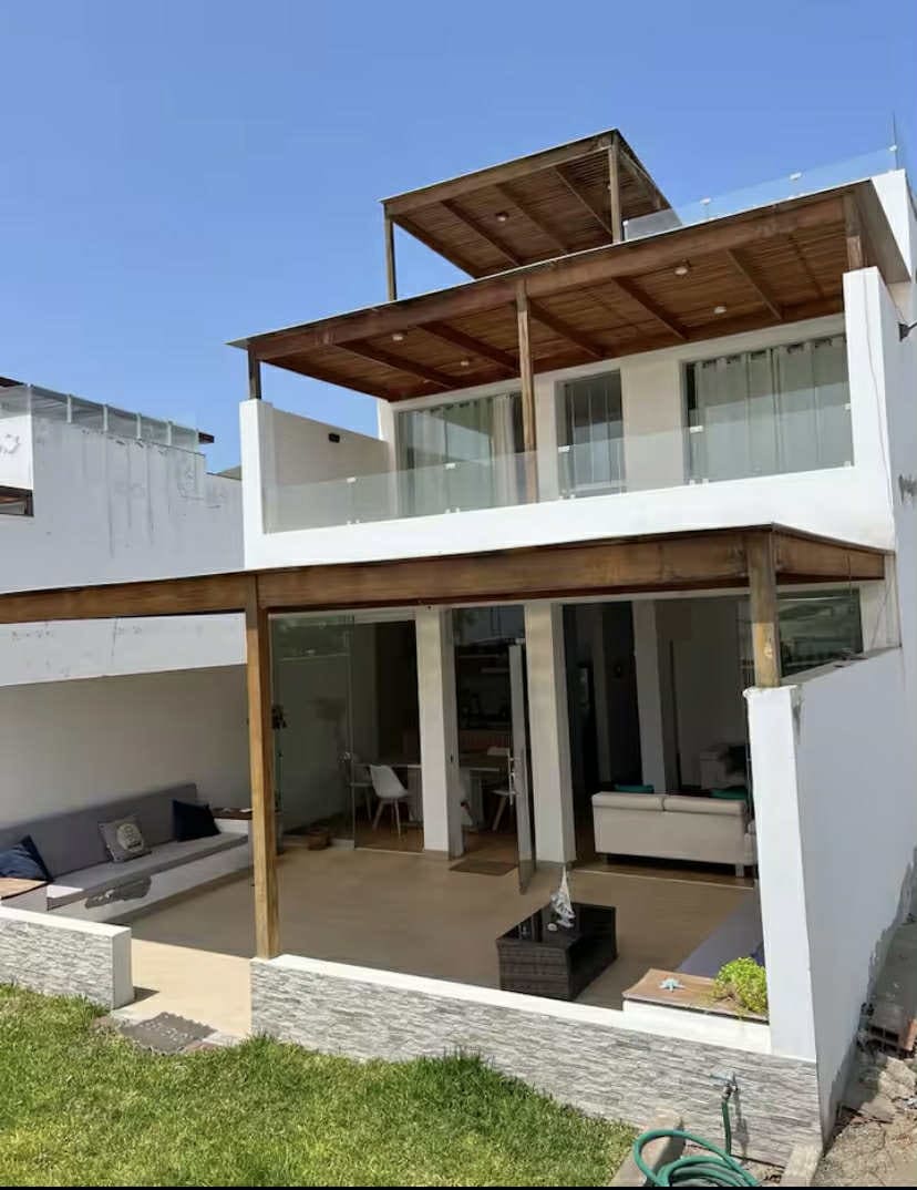 Casa DE ESTRENO de playa en Km 88.8 Panamericana Sur (Condominio Privado) a 5 min del Boulevard de Asia, con vista a la laguna y salida directa al mar. 3 pisos, 6 dormitorios (2 Kings, 1 de 2 plazas, 2 dobles, 1 cuádruple), 5 baños, 2 salas, sala de TV, internet Wifi, 2 comedores, cocina totalmente equipada con electrodomésticos, tercer piso con sol y sombra, zona de parrillas, jacuzzi para 4 personas solo en verano, estacionamiento y vigilancia privada 24h
