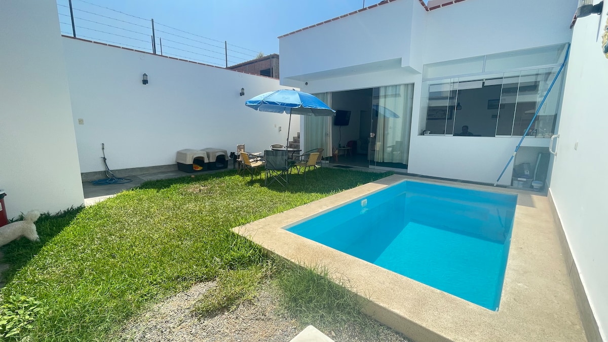 Villa a 5 min de la Playa Cerro Azul, Lobitos y a 20min de Asia, queda en la misma Panamericana Sur, con piscina privada grande incluida. Cercada, pet friendly, cuenta con 6 cuartos amplios con baño incluido c/u y mesa para trabajo/estudio remoto, capacidad 16 personas. Cuenta con parrilla, juegos para niños, ping pong, hamacas y áreas verdes, DirecTv.