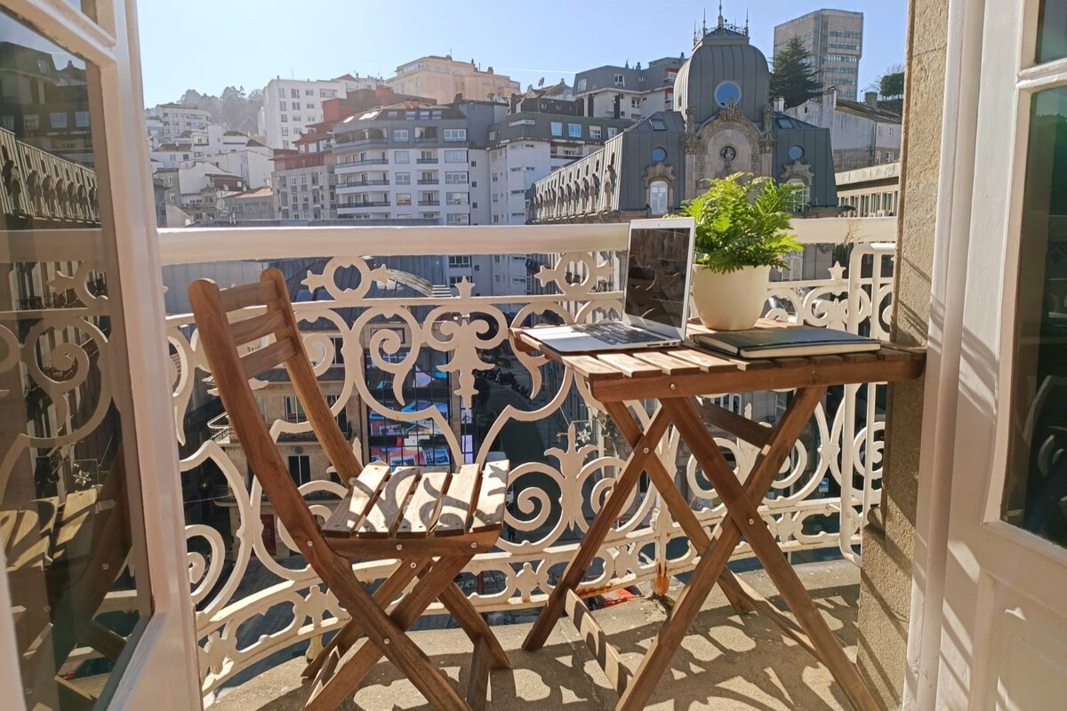 Una experiencia de lujo en este céntrico y luminoso apartamento equipado como una suite de hotel. Edificio histórico. El dormitorio, presidido por una confortable cama King size, Smart TV, balcón y un baño completo. El salón cuenta con una coqueta cocina americana, un comedor, Smart TV de gran formato, una cómoda mesa de trabajo junto al ventanal y un sofá- cama. Dos ventanales de tres metros de altura con balcones que se asoman a la “Puerta del Sol de Vigo”. Próximo al puerto- Islas-Cíes