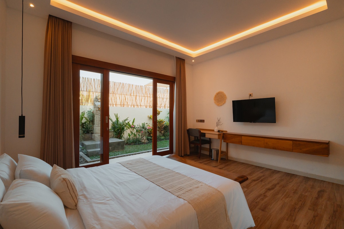 Discover a modern guesthouse in Pererenan with beautiful views of the surrounding rice fields. Our peaceful setting is ideal for relaxation. Enjoy meals by the pool or delivered to your room from our on-site restaurant. With reliable internet throughout the property, working remotely is effortless. Choose between our loft apartment with a kitchen or one of our comfortable rooms for a stay tailored to your needs.