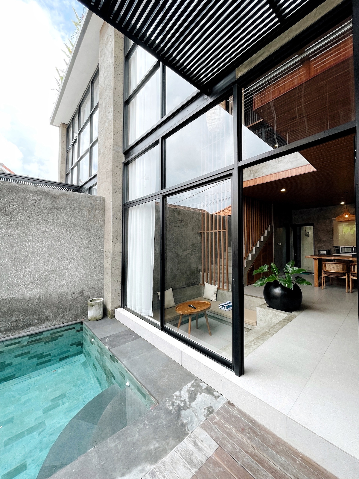 Enjoy your romantic private times in a luxurious complex, close to a fine selection of world-class cafes, restaurants and beach clubs. But perfectly hidden in a serene and quiet villa neighbourhood. This villa features an ensuite bathtub and offers a perfect dip-in pool. Enjoy your floating breakfast under the wood panels with sunlight gently pouring through. Chillax on the bean bag or sun loungers at your choice while soaking up the view of the garden.
