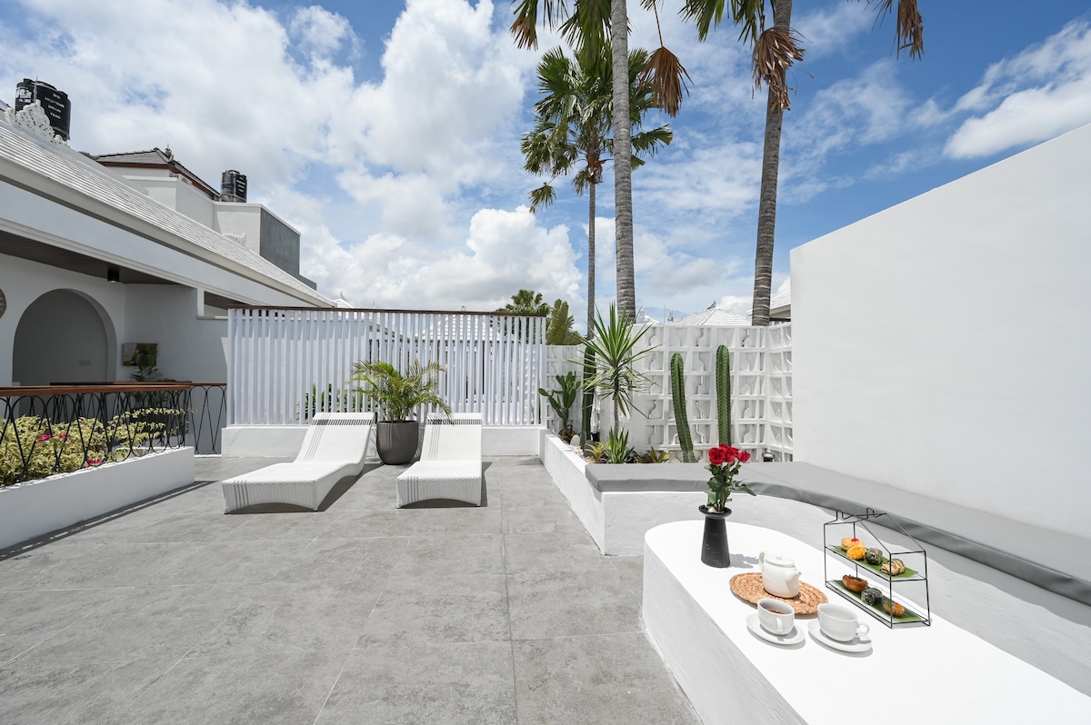 Enjoy your romantic private times in a luxurious complex, close to a fine selection of world-class cafes, restaurants and beach clubs. But perfectly hidden in a serene and quiet villa neighbourhood. This villa features an ensuite bathtub and offers a perfect dip-in pool. Enjoy your floating breakfast under the wood panels with sunlight gently pouring through. Chillax on the bean bag or sun loungers at your choice while soaking up the view of the garden.