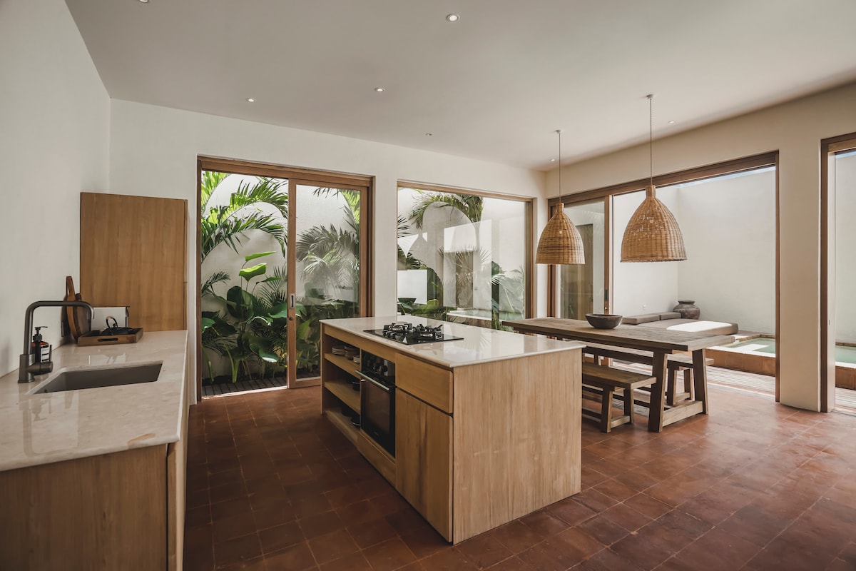 Welcome to our luxury villa in the heart of Canggu, just 500m from the beach and surrounded by 40+ cafés and restaurants within walking distance. Enjoy carefree days with your private pool, tropical garden and daily cleaning. ✔ Air conditioning in bedroom, living room & kitchen ✔ Private pool ✔ Daily cleaning ✔ Beach & bath towels included ✔ Fresh drinking water dispenser ✔ Skylight bathtub ✔ Tropical bedroom view ✔ Fully equipped kitchen ✔ Fast WiFi ✔ Smart TV