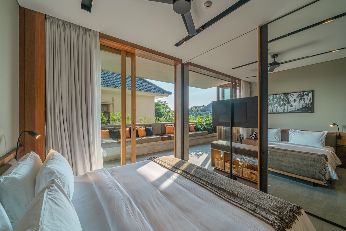 Discover modern comfort at our second floor two-bedroom smart apartment, just a stone's throw from Pererenan Beach. This stylish retreat features a private living room, a fully equipped kitchen, and a cozy dining area. Unwind in the private whirpool tub or retreat to the master bedroom, complete with an ensuite bathroom and a private workspace. The second bedroom offers a shared bathroom, perfect for families or couples seeking a relaxing getaway
