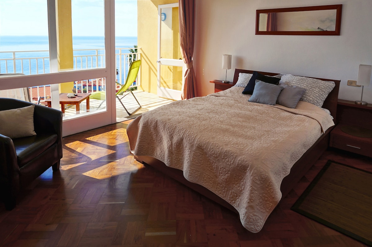 Mit ihrer direkten Sicht auf den Atlantik, ist diese Ferienwohnung das perfekte Ziel für einen entspannten Urlaub. Die Ferienwohnung verfügt über zwei Balkone, ein stilvolles Schlafzimmer und einen großzügigen Wohn-/Essbereich. Unser Apartment liegt im selben Haus wie die professionelle Tauchbasis Madeira Diving Center. Morgens aufwachen, aufs Meer schauen – und wenige Schritte später ins Abenteuer starten. Auch Nicht-Taucher profitieren von der ruhigen Lage und dem Meerblick.