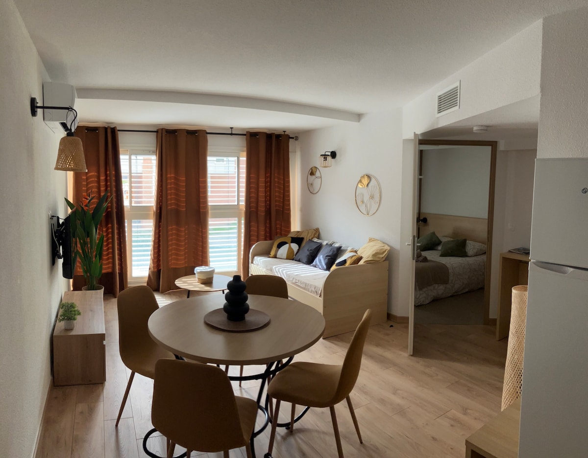 Studio rénové avec soin, ambiance moderne. Emplacement calme, terrasse avec vue sur le pic de la Pena. À 5 minutes à pieds du centre-ville, 10 minutes des commerces. Lit double, lit simple, cuisine, salle de bains. Avantages inclus : draps, linge de bain, lave-linge, barbecue, wifi, TV.