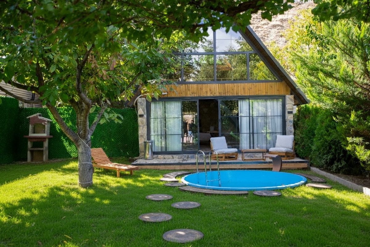 ALAÇATI KONSEPT EVİMİZ ÜÇGEN BUNGALOV DOĞAL TAŞ VE AHŞABIN UYUMU ŞÖMİNE SICAK YÜZME HAVUZU BARBEKÜ SADECE SİZE AİT MÜSTAKİL BİR ALAN TAMAMEN GÜVENLİ ÇOK KEYİFLİ