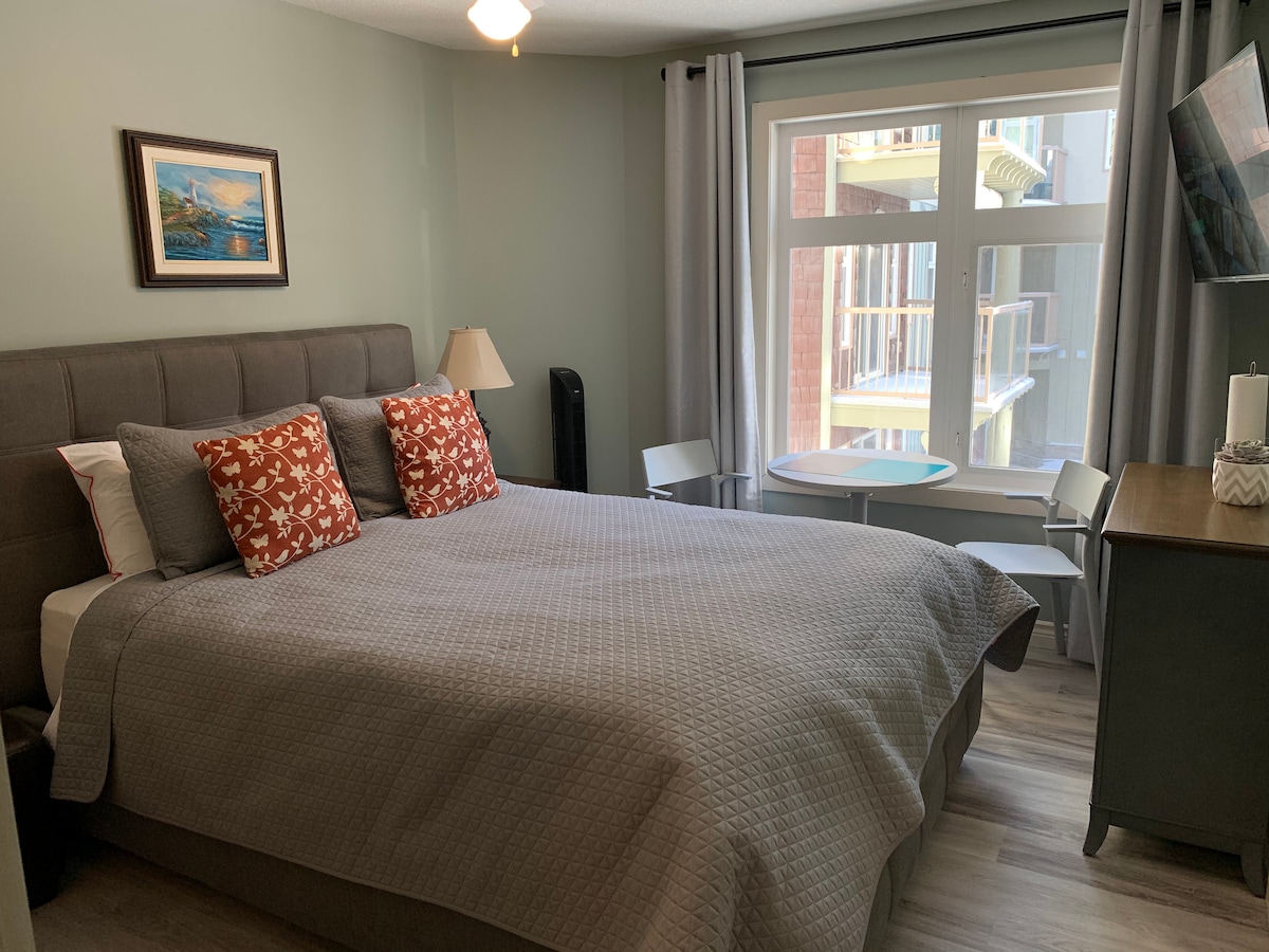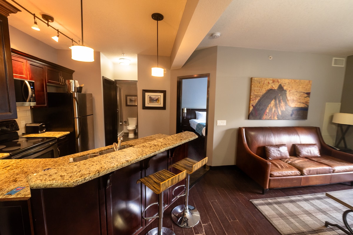 Luxury In The Lodges at Canmore. 28 min to Norquay, 32 to Sunshine. Easy walk to the city center, parks, and public transport. Great location and mountain views. 30 min to Banff, 60 min to Lake Louise. One Bedroom with king bed is best suited for two. There is also a queen sofa sleeper best suited for smaller people. Mini-split AC in bedroom and living area. Gas fireplace. Gas BBQ. Full kitchen. Underground parking No pets please. No parties. Canmore Business License RES-1234